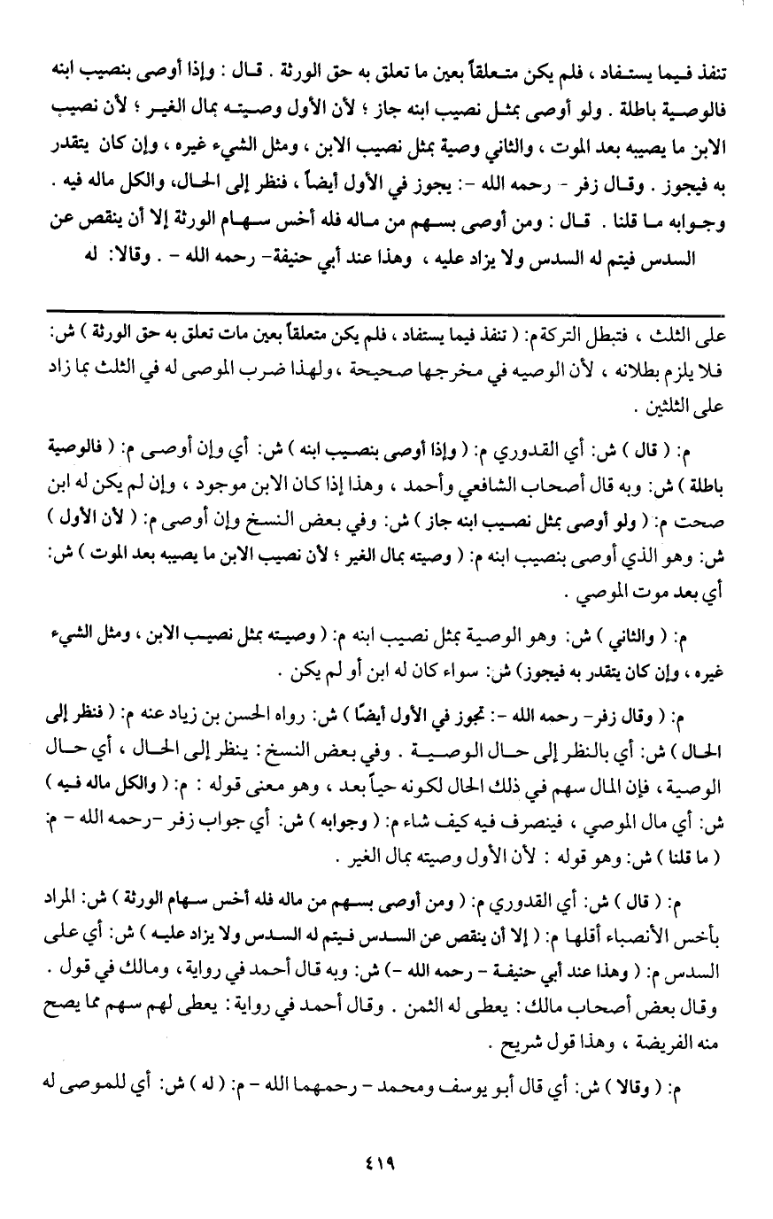 تنفذ فيما يستفاد، فلم يكن متعلقا بعين ما تعلق به حق الورثة. قال: وإذا أوصى بنصيب ابنه فالوصية باطلة. ولو أوصى بمثل نصيب ابنه جاز؛ لأن الأول وصيته بمال الغير؛ لأن نصيب الابن ما يصيبه بعد الموت، والثاني وصية بمثل نصيب الابن، ومثل الشيء غيره، وإن كان يتقدر به فيجوز. وقال زفر - رَحِمَهُ اللَّهُ -: يجوز في الأول أيضا، فنظر إلى الحال، والكل ماله فيه. وجوابه ما قلنا.