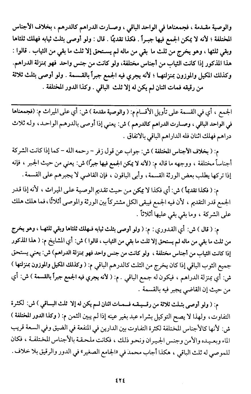 ـــــــــــــــــــــــــــــQالجمع، أي في القسمة على تأويل الأقسام م: (والوصية مقدمة) ش: أي على الميراث م: (فجمعناها في الواحد الباقي، وصارت الدراهم كالدرهم) ش: يعني إذا أوصى بالدرهم الواحد، وله ثلاث دراهم فهلك اثنان فله الدرهم الباقي بالاتفاق.