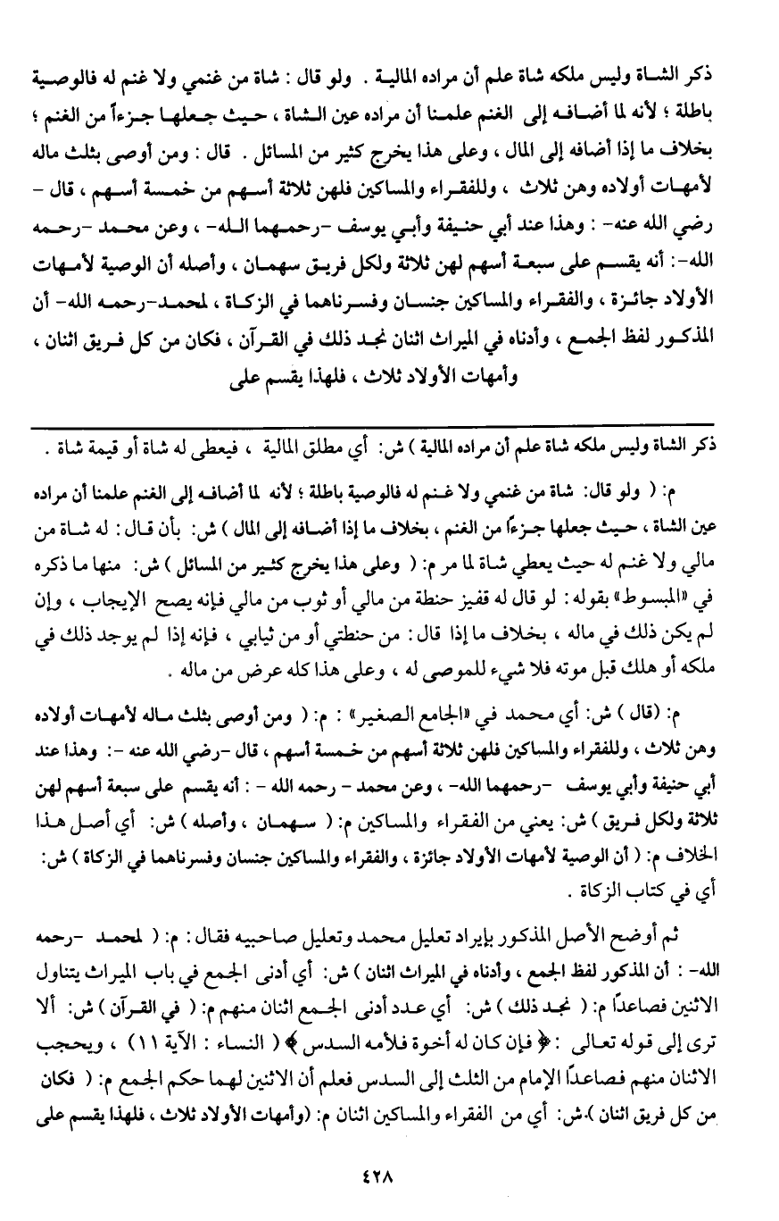 ذكر الشاة وليس ملكه شاة علم أن مراده المالية. ولو قال: شاة من غنمي ولا غنم له فالوصية باطلة؛ لأنه لما أضافه إلى الغنم علمنا أن مراده عين الشاة، حيث جعلها جزءا من الغنم؛ بخلاف ما إذا أضافه إلى المال، وعلى هذا يخرج كثير من المسائل. قال: ومن أوصى بثلث ماله لأمهات أولاده وهن ثلاث، وللفقراء والمساكين فلهن ثلاثة أسهم من خمسة أسهم، قال - رَضِيَ اللَّهُ عَنْهُ -: وهذا عند أبي حنيفة وأبي يوسف - رحمهما الله -، وعن محمد - رَحِمَهُ اللَّهُ -: أنه يقسم على سبعة أسهم لهن ثلاثة ولكل فريق سهمان، وأصله أن الوصية لأمهات الأولاد جائزة، والفقراء والمساكين جنسان وفسرناهما في الزكاة، لمحمد - رَحِمَهُ اللَّهُ - أن المذكور لفظ الجمع، وأدناه في الميراث اثنان نجد ذلك في القرآن، فكان من كل فريق اثنان، وأمهات الأولاد ثلاث، فلهذا يقسم على