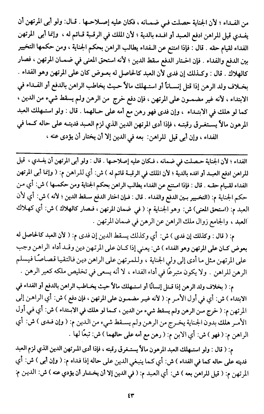 من الفداء؛ لأن الجناية حصلت في ضمانه، فكان عليه إصلاحها. قال: ولو أبى المرتهن أن يفدي قيل للراهن ادفع العبد أو افده بالدية؛ لأن الملك في الرقبة قائم له، وإنما أبى المرتهن الفداء لقيام حقه. قال: فإذا امتنع عن الفداء يطالب الراهن بحكم الجناية، ومن حكمها التخيير بين الدفع والفداء. فإن اختار الدفع سقط الدين؛ لأنه استحق المعنى في ضمان المرتهن، فصار كالهلاك. قال: وكذلك إن فدى لأن العبد كالحاصل له بعوض كان على المرتهن وهو الفداء. بخلاف ولد الرهن إذا قتل إنسانا أو استهلك مالا حيث يخاطب الراهن بالدفع أو الفداء في الابتداء؛ لأنه غير مضمون على المرتهن، فإن دفع خرج من الرهن ولم يسقط شيء من الدين، كما لو هلك في الابتداء، وإن فدى فهو رهن مع أمه على حالهما. قال: ولو استهلك العبد المرهون مالا يستغرق رقبته، فإذا أدى المرتهن الدين الذي لزم العبد فديته على حاله كما في الفداء، وإن أبى قيل للراهن: بعه في الدين إلا أن يختار أن يؤدى عنه،