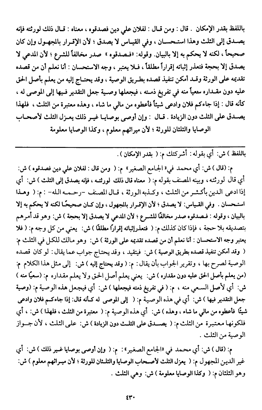 م: (قال) ش: أي محمد في " الجامع الصغير " م: (ومن قال: لفلان علي دين فصدقوه) ش: أي قال لورثته، وبينه المصنف بقوله م: (معناه قال ذلك لورثته، فإنه يصدق إلى الثلث) ش: أي إذا ادعى الدين بأكثر من الثلث، وكذبه الورثة، قال المصنف - رَحِمَهُ اللَّهُ -: م: (وهذا استحسان. وفي القياس: لا يصدق؛ لأن الإقرار بالمجهول، وإن كان صحيحا لكنه لا يحكم به إلا بالبيان، وقوله: "فصدقوه" صدر مخالفا للشرع: لأن المدعي لا يصدق إلا بحجة) ش: وهو قد أمرهم بتصديقه بلا حجة، فإذا كان كذلك م: (فتعذر إثباته إقرارا مطلقا) ش: يعني من كل وجه م: (فلا يعتبر وجه الاستحسان: أنا نعلم أن من قصده تقديمه على الورثة) ش: وهو مالك للكل في الثلث م: (وقد أمكن تنفيذ قصده بطريق الوصية) ش: فيتقيد، وقد يحتاج جواب عما يقال: لو كان قصده الوصية لصرح بها، وتقرير الجواب بأن يقال: م: (وقد يحتاج إليه) ش: إلى مثل هذا الكلام م: (من يعلم بأصل الحق عليه دون مقداره) ش: يعني يعلم أصل الحق ولا يعلم مقداره م: (سعيا منه) ش: أي لأصل السعي منه، م: (في تفريغ ذمته فيجعلها) ش: أي فيجعل هذه الوصية م: (وصية جعل التقدير فيها) ش: أي في هذه الوصية م: (إلى الموصى له كأنه قال: إذا جاءكم فلان وادعى شيئا فأعطوه من مالي ما شاء، وهذه) ش: أي هذه الوصية م: (معتبرة من الثلث، فلهذا) ش:، أي فلكونها معتبرة من الثلث م: (يصدق على الثلث دون الزيادة) ش: على الثلث؛ لأن جواز الوصية من الثلث.