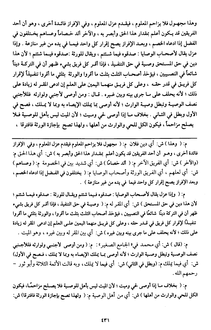 ـــــــــــــــــــــــــــــQم: (وهذا) ش: أي دين فلان م: (مجهول فلا يزاحم المعلوم فيقدم عزل المعلوم، وفي الإفراز فائدة أخرى، وهو أن أحد الفريقين قد يكون أعلم بمقدار هذا الحق وأبصر به) ش: أي هذا الحق م: (والآخر) ش: أي الفريق الآخر م: (ألد خصاما) ش: أي شديد بين في الخصومة م: (وعساهم) ش: أي لعلهم، أي الفريق الورثة وأصحاب الوصايا م: (يختلفون في الفضل إذا ادعاه الخصم، وبعد الإفراز يصح إقرار كل واحد فيما في يده من غير منازعة) .
