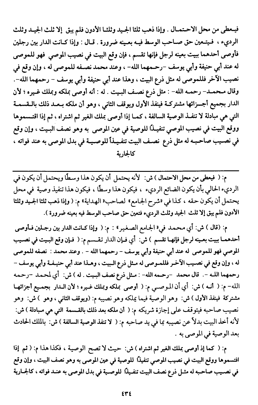 فيعطى من محل الاحتمال. وإذا ذهب ثلثا الجيد وثلثا الأدون فلم يبق إلا ثلث الجيد وثلث الرديء، فيتعين حق صاحب الوسط فيه بعينه ضرورة. قال: وإذا كانت الدار بين رجلين فأوصى أحدهما ببيت بعينه لرجل فإنها تقسم، فإن وقع البيت، في نصيب الموصي فهو للموصى له عند أبي حنيفة وأبي يوسف - رحمهما الله -، وعند محمد نصفه للموصى له، وإن وقع في نصيب الآخر فللموصى له مثل ذرع البيت، وهذا عند أبي حنيفة وأبي يوسف - رحمهما الله -. وقال محمد - رَحِمَهُ اللَّهُ -: مثل ذرع نصف البيت. له: أنه أوصى بملكه وبملك غيره؛ لأن الدار بجميع أجزائها مشتركة فينفذ الأول ويوقف الثاني، وهو أن ملكه بعد ذلك بالقسمة التي هي مبادلة لا تنفذ الوصية السالفة، كما إذا أوصى بملك الغير ثم اشتراه، ثم إذا اقتسموها ووقع البيت في نصيب الموصي تنفيذا للوصية في عين الموصى به وهو نصف البيت، وإن وقع في نصيب صاحبه له مثل ذرع نصف البيت تنفيذا للوصية في بدل الموصى به عند فواته، كالجارية