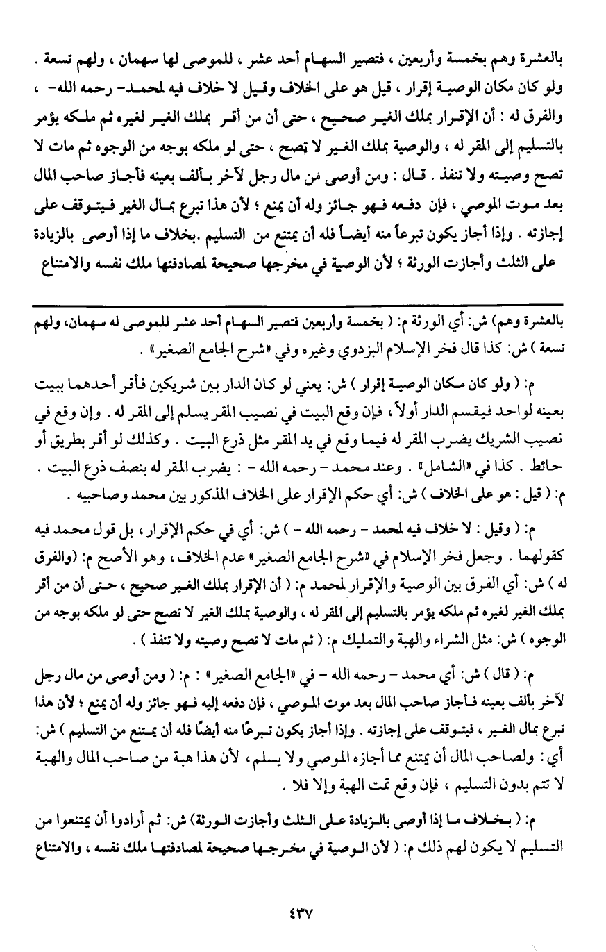 بالعشرة وهم بخمسة وأربعين، فتصير السهام أحد عشر، للموصى لها سهمان، ولهم تسعة. ولو كان مكان الوصية إقرار، قيل هو على الخلاف وقيل لا خلاف فيه لمحمد - رَحِمَهُ اللَّهُ -، والفرق له: أن الإقرار بملك الغير صحيح، حتى إن من أقر بملك الغير لغيره ثم ملكه يؤمر بالتسليم إلى المقر له، والوصية بملك الغير لا تصح، حتى لو ملكه بوجه من الوجوه ثم مات لا تصح وصيته ولا تنفذ. قال: ومن أوصى من مال رجل لآخر بألف بعينه فأجاز صاحب المال بعد موت الموصي، فإن دفعه فهو جائز وله أن يمنع؛ لأن هذا تبرع بمال الغير فيتوقف على إجازته. وإذا أجاز يكون تبرعا منه أيضا فله أن يمتنع من التسليم. بخلاف ما إذا أوصى بالزيادة على الثلث وأجازت الورثة؛ لأن الوصية في مخرجها صحيحة لمصادفتها ملك نفسه والامتناع