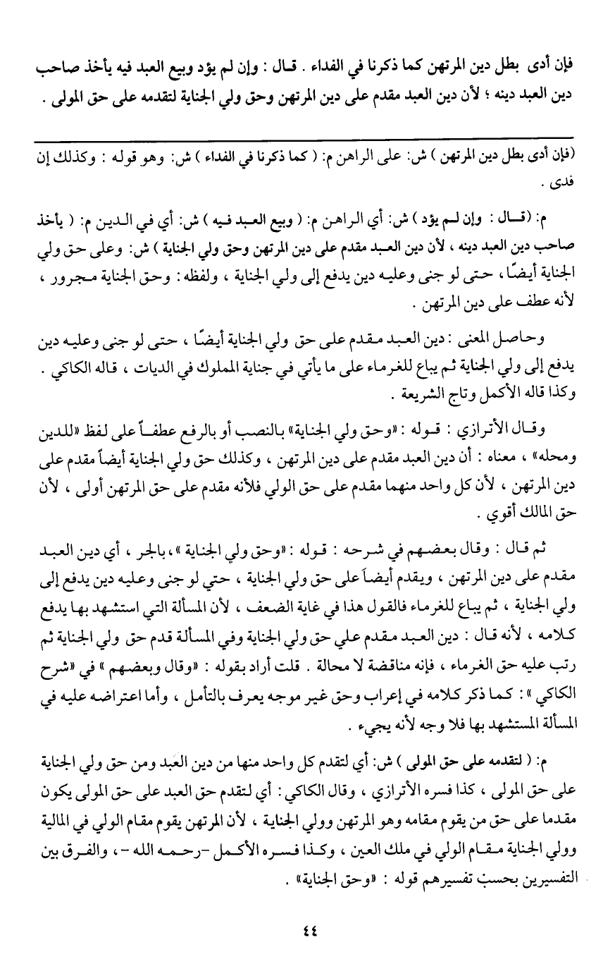 ثم قال: وقال بعضهم في شرحه: قوله: " وحق ولي الجناية "، بالجر، أي دين العبد مقدم على دين المرتهن، ويقدم أيضا على حق ولي الجناية، حتى لو جنى وعليه دين يدفع إلى ولي الجناية. ثم يباع للغرماء فالقول هذا في غاية الضعف. لأن المسألة التي استشهد بها يدفع كلامه؛ لأنه قال: دين العبد مقدم على حق ولي الجناية وفي المسألة قدم حق ولي الجناية ثم رتب عليه حق الغرماء. فإنه مناقضة لا محالة. قلت أراد بقوله: " وقال وبعضهم " في " شرح الكاكي ": كما ذكر كلامه في إعراب وحق غير موجه يعرف بالتأمل. وأما اعتراضه عليه في المسألة المستشهد بها فلا وجه لأنه يجيء.