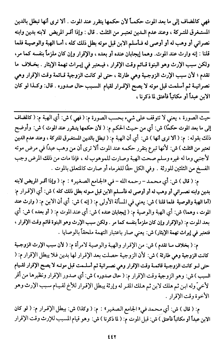 م: (بخلاف ما تقدم) ش: من الإقرار والهبة والوصية لامرأة م: (لأن سبب الإرث الزوجية كانت الزوجية وهي طارئة) ش: لأن الزوجية حصلت بعد الإقرار لها بدين فلا يبطل الإقرار م: (حتى لو كانت الزوجية قائمة وقت الإقرار وهي نصرانية ثم أسلمت قبل موته لا يصح الإقرار لقيام السبب) ش: وهو الزوجية وقت الإقرار م: (حال صدوره) ش: أي صدور الإقرار ونظيرها من أقر لأخي وله ابن ثم هلك الابن ثم هلك المقر له وإرثه يبطل الإقرار للأخ لقيام سبب الإرث وهو الأخوة وقت الإقرار.