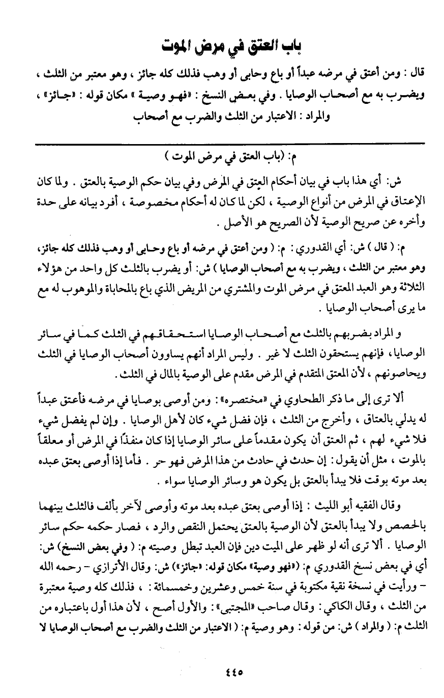 ش: أي هذا باب في بيان أحكام العتق في المرض وفي بيان حكم الوصية بالعتق. ولما كان الإعتاق في المرض من أنواع الوصية، لكن لما كان له أحكام مخصوصة، أفرد بيانه على حدة وأخره عن صريح الوصية لأن الصريح هو الأصل.