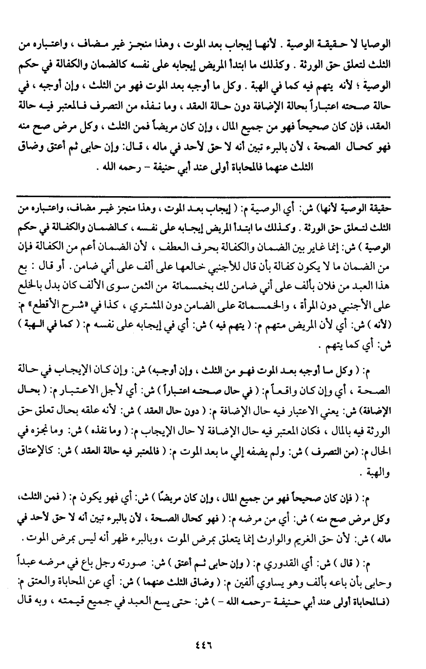 الوصايا لا حقيقة الوصية. لأنها إيجاب بعد الموت، وهذا منجز غير مضاف، واعتباره من الثلث لتعلق حق الورثة. وكذلك ما ابتدأ المريض إيجابه على نفسه كالضمان والكفالة في حكم الوصية؛ لأنه يتهم فيه كما في الهبة. وكل ما أوجبه بعد الموت فهو من الثلث، وإن أوجبه في حالة صحته اعتبارا بحالة الإضافة دون حالة العقد، وما نفذه من التصرف فالمعتبر فيه حالة العقد، فإن كان صحيحا فهو من جميع المال، وإن كان مريضا فمن الثلث، وكل مرض صح منه فهو كحال الصحة؛ لأن بالبرء تبين أنه لا حق لأحد في ماله، قال: وإن حابى ثم أعتق وضاق الثلث عنهما فالمحاباة أولى عند أبي حنيفة - رَحِمَهُ اللَّهُ -