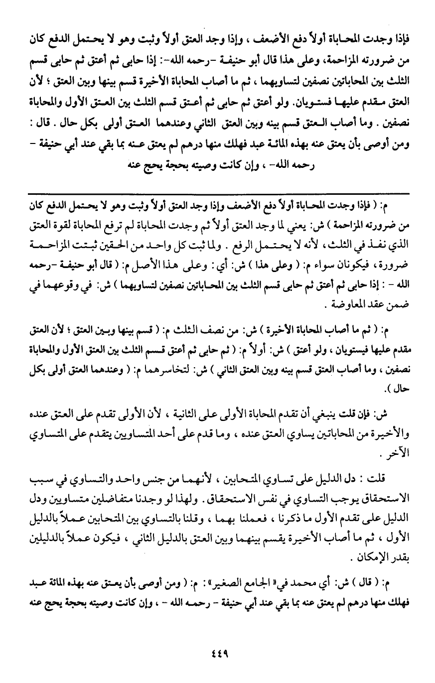 فإذا وجدت المحاباة أولا دفع الأضعف، وإذا وجد العتق أولا وثبت وهو لا يحتمل الدفع كان من ضرورته المزاحمة، وعلى هذا قال أبو حنيفة - رَحِمَهُ اللَّهُ -: إذا حابى ثم أعتق ثم حابى قسم الثلث بين المحاباتين نصفين لتساويهما، ثم ما أصاب المحاباة الأخيرة قسم بينها وبين العتق؛ لأن العتق مقدم عليها فيستويان. ولو أعتق ثم حابى ثم أعتق قسم الثلث بين العتق الأول والمحاباة نصفين. وما أصاب العتق قسم بينه وبين العتق الثاني وعندهما العتق أولى بكل حال. قال: ومن أوصى بأن يعتق عنه بهذه المائة عبد فهلك منها درهم لم يعتق عنه بما بقي عند أبي حنيفة - رَحِمَهُ اللَّهُ -، وإن كانت وصيته بحجة يحج عنه