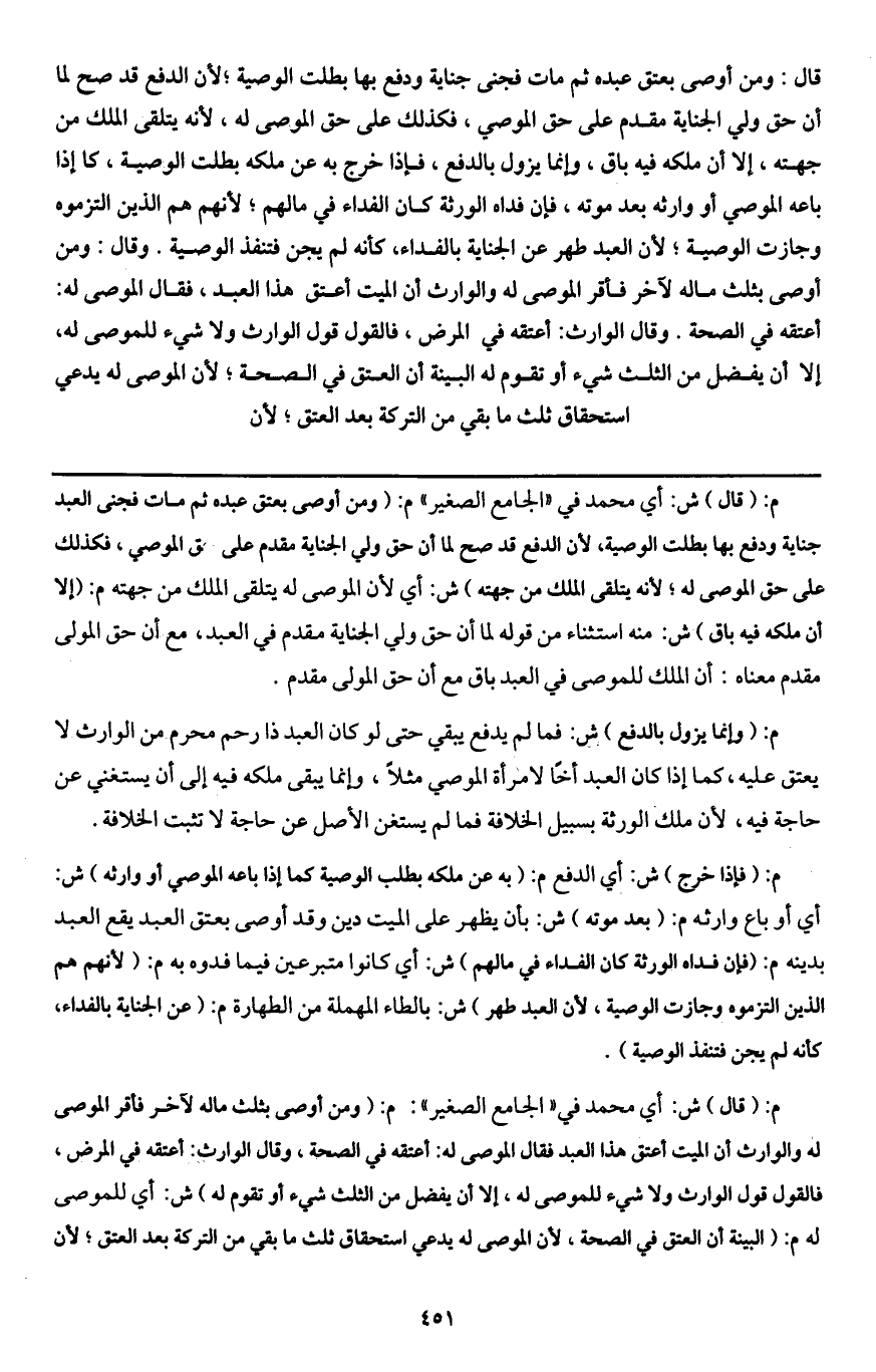 م: (قال) ش: أي محمد في " الجامع الصغير " م: (ومن أوصى بعتق عبده ثم مات فجنى العبد جناية ودفع بها بطلت الوصية؛ لأن الدفع قد صح لما أن حق ولي الجناية مقدم على حق الموصي، فكذلك على حق الموصى له؛ لأنه يتلقى الملك من جهته) ش: أي لأن الموصى له يتلقى الملك من جهته م: (إلا أن ملكه فيه باق) ش: منه استثناء من قوله لما أن حق ولي الجناية مقدم في العبد، مع أن حق المولى مقدم معناه: أن الملك للموصى في العبد باق مع أن حق المولى مقدم.