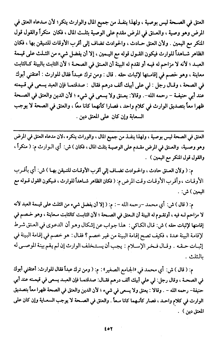 م: (قال) ش: أي محمد - رَحِمَهُ اللَّهُ -: م: (إلا أن يفضل شيء من الثلث على قيمة العبد لأنه لا مزاحم له فيه، أو تقوم له البينة أن العتق في الصحة؛ لأن الثابت كالثابت معاينة، وهو خصم في إقامتها لإثبات حقه) ش: قال الكاكي: هذا جواب عن إشكال وهو أن الدعوى في العتق شرط لإقامة البينة عدة، فكيف تصح إقامة البينة من غير خصم؛ فقال: هو خصم في إقامة البينة في إثبات حقه. وقال فخر الإسلام: يجب أن يستخلف الوارث إن لم يقم بينة الموصى له بالثلث.