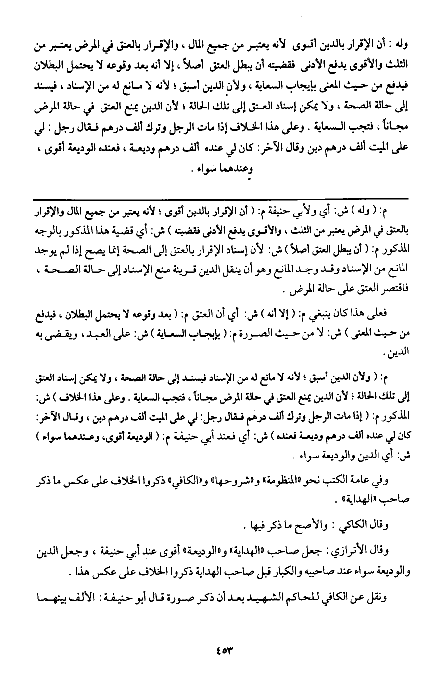 وله: أن الإقرار بالدين أقوى لأنه يعتبر من جميع المال؛ والإقرار بالعتق في المرض يعتبر من الثلث والأقوى يدفع الأدنى فقضيته أن يبطل العتق أصلا؛ إلا أنه بعد وقوعه لا يحتمل البطلان فيدفع من حيث المعنى بإيجاب السعاية، ولأن الدين أسبق؛ لأنه لا مانع له من الإسناد؛ فيسند إلى حالة الصحة، ولا يمكن إسناد العتق إلى تلك الحالة؛ لأن الدين يمنع العتق في حالة المرض مجانا فتجب السعاية. وعلى هذا الخلاف إذا مات الرجل وترك ألف درهم فقال رجل: لي على الميت ألف درهم دين وقال الآخر: كان لي عنده ألف درهم وديعة؛ فعنده الوديعة أقوى، وعندهما سواء.