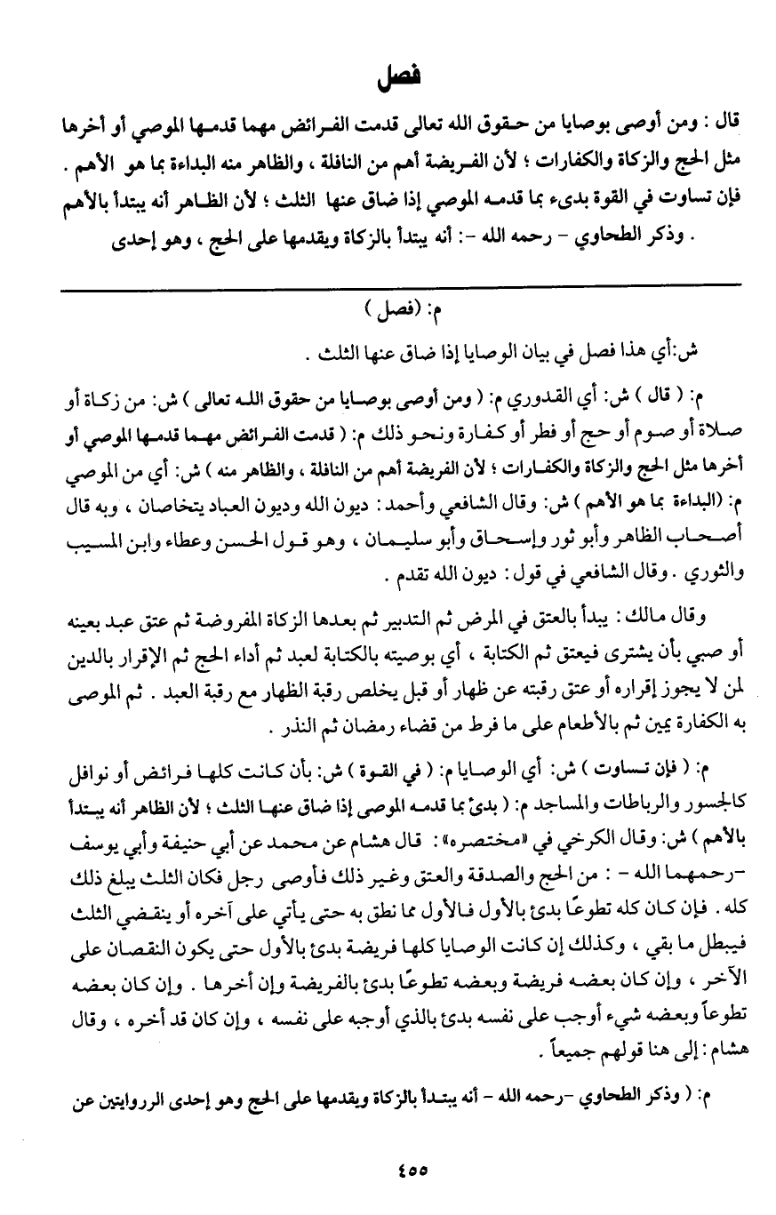فصل قال: ومن أوصى بوصايا من حقوق الله تعالى قدمت الفرائض مهما قدمها الموصي أو أخرها مثل الحج والزكاة والكفارات؛ لأن الفريضة أهم من النافلة، والظاهر منه البداءة بما هو الأهم.