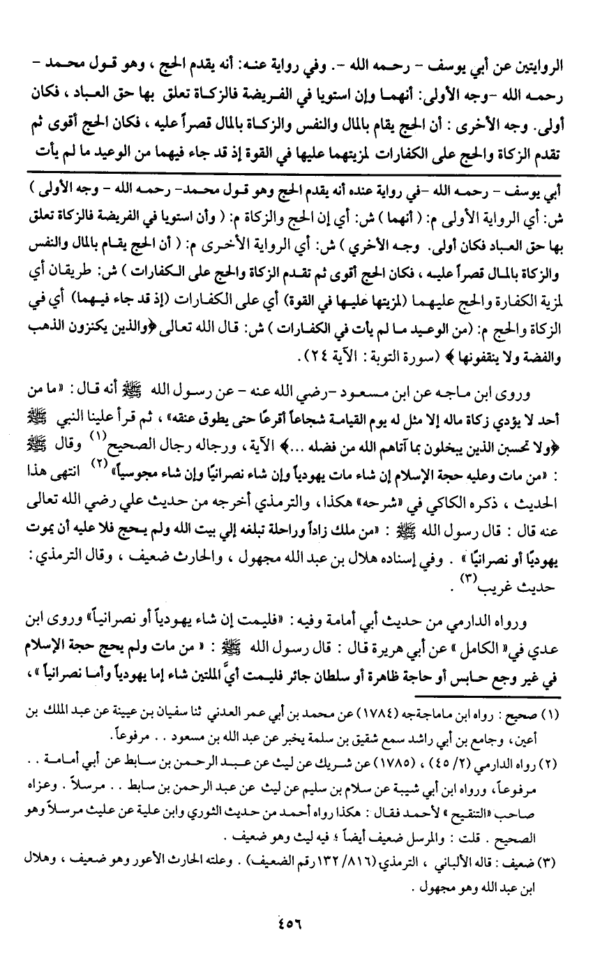 وروى ابن ماجه عن ابن مسعود - رَضِيَ اللَّهُ عَنْهُ - عن رسول الله - صَلَّى اللَّهُ عَلَيْهِ وَسَلَّمَ - أنه قال: «ما من أحد لا يؤدي زكاة ماله إلا مثل له يوم القيامة شجاعا أقرعا حتى يطوق عنقه) ثم قرأ علينا النبي - صَلَّى اللَّهُ عَلَيْهِ وَسَلَّمَ - {وَلَا يَحْسَبَنَّ الَّذِينَ يَبْخَلُونَ بِمَا آتَاهُمُ اللَّهُ مِنْ فَضْلِهِ} [آل عمران: 180] الآية» ورجاله رجال الصحيح، وقال: - صَلَّى اللَّهُ عَلَيْهِ وَسَلَّمَ -: «من مات وعليه حجة الإسلام إن شاء مات يهوديا وإن شاء نصرانيا وإن شاء مجوسيا» انتهى هذا الحديث، ذكره الكاكي في "شرحه " هكذا، والترمذي أخرجه من حديث علي - رَضِيَ اللَّهُ تَعَالَى عَنْهُ - قال: قال رسول الله - صَلَّى اللَّهُ عَلَيْهِ وَسَلَّمَ -: «من ملك زادا وراحلة تبلغه إلى بيت الله ولم يحج فلا عليه أن يموت يهوديا أو نصرانيا» . وفي إسناده هلال بن عبد الله مجهول، والحارث ضعيف، وقال الترمذي: حديث غريب.