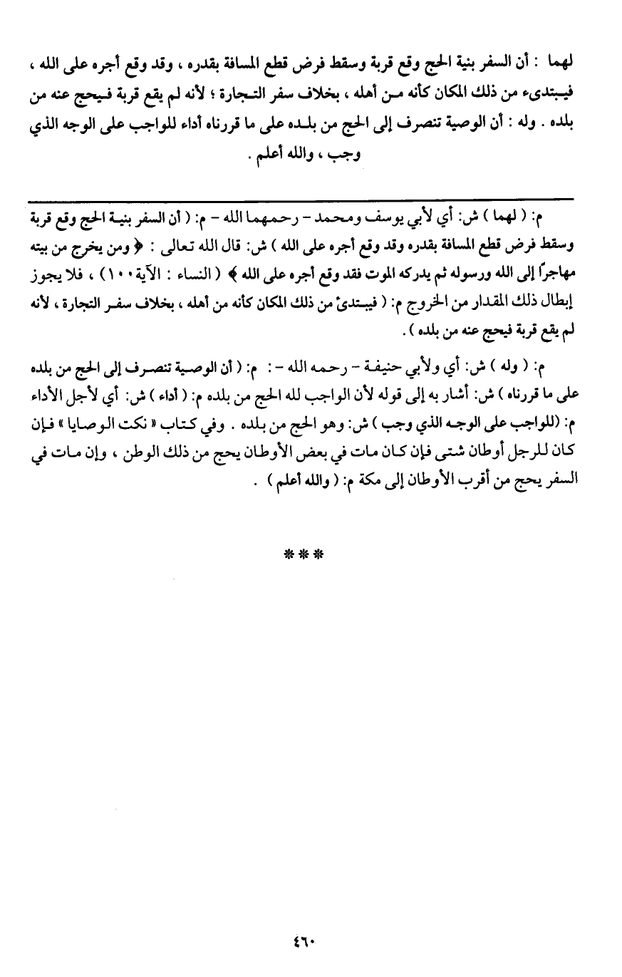 ـــــــــــــــــــــــــــــQم: (لهما) ش: أي لأبي يوسف ومحمد - رحمهما الله - م: (أن السفر بنية الحج وقع قربة وسقط فرض قطع المسافة بقدره وقد وقع أجره على الله) ش: قال الله تعالى: {وَمَنْ يَخْرُجْ مِنْ بَيْتِهِ مُهَاجِرًا إِلَى اللَّهِ وَرَسُولِهِ ثُمَّ يُدْرِكْهُ الْمَوْتُ فَقَدْ وَقَعَ أَجْرُهُ عَلَى اللَّهِ} [النساء: 100] (النساء: الآية 100) ، فلا يجوز إبطال ذلك المقدار من الخروج م: (فيبتدئ من ذلك المكان كأنه من أهله، بخلاف سفر التجارة؛ لأنه لم يقع قربة فيحج عنه من بلده) .