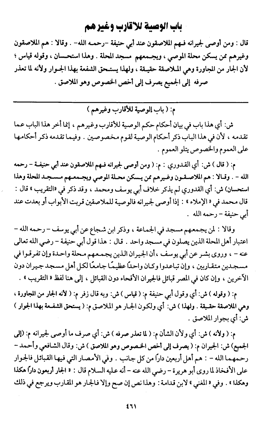 باب الوصية للأقارب وغيرهم قال: ومن أوصى لجيرانه فهم الملاصقون عند أبي حنيفة - رَحِمَهُ اللَّهُ -. وقالا: هم الملاصقون وغيرهم ممن يسكن محلة الموصي ويجمعهم مسجد المحلة. وهذا استحسان، وقوله قياس؛ لأن الجار من المجاورة وهي الملاصقة حقيقة ولهذا يستحق الشفعة بهذا الجوار، ولأنه لما تعذر صرفه إلى الجميع يصرف إلى أخص الخصوص وهو الملاصق.