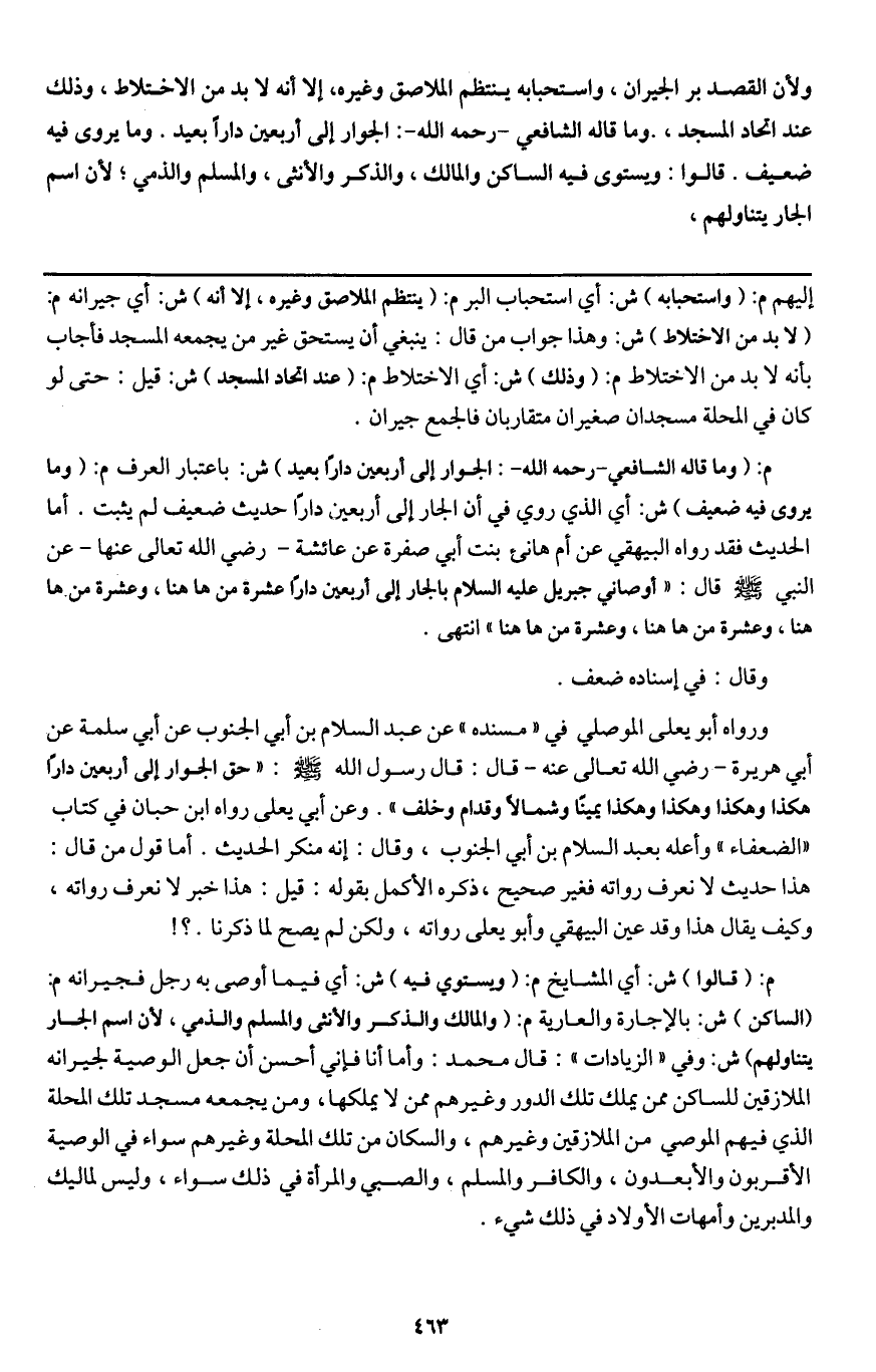 ولأن القصد بر الجيران، واستحبابه ينتظم الملاصق وغيره، إلا أنه لا بد من الاختلاط، وذلك عند اتحاد المسجد. وما قاله الشافعي - رَحِمَهُ اللَّهُ -: الجوار إلى أربعين دارا بعيد. وما يروى فيه ضعيف. قالوا: ويستوي فيه الساكن والمالك، والذكر والأنثى، والمسلم والذمي؛ لأن اسم الجار يتناولهم،