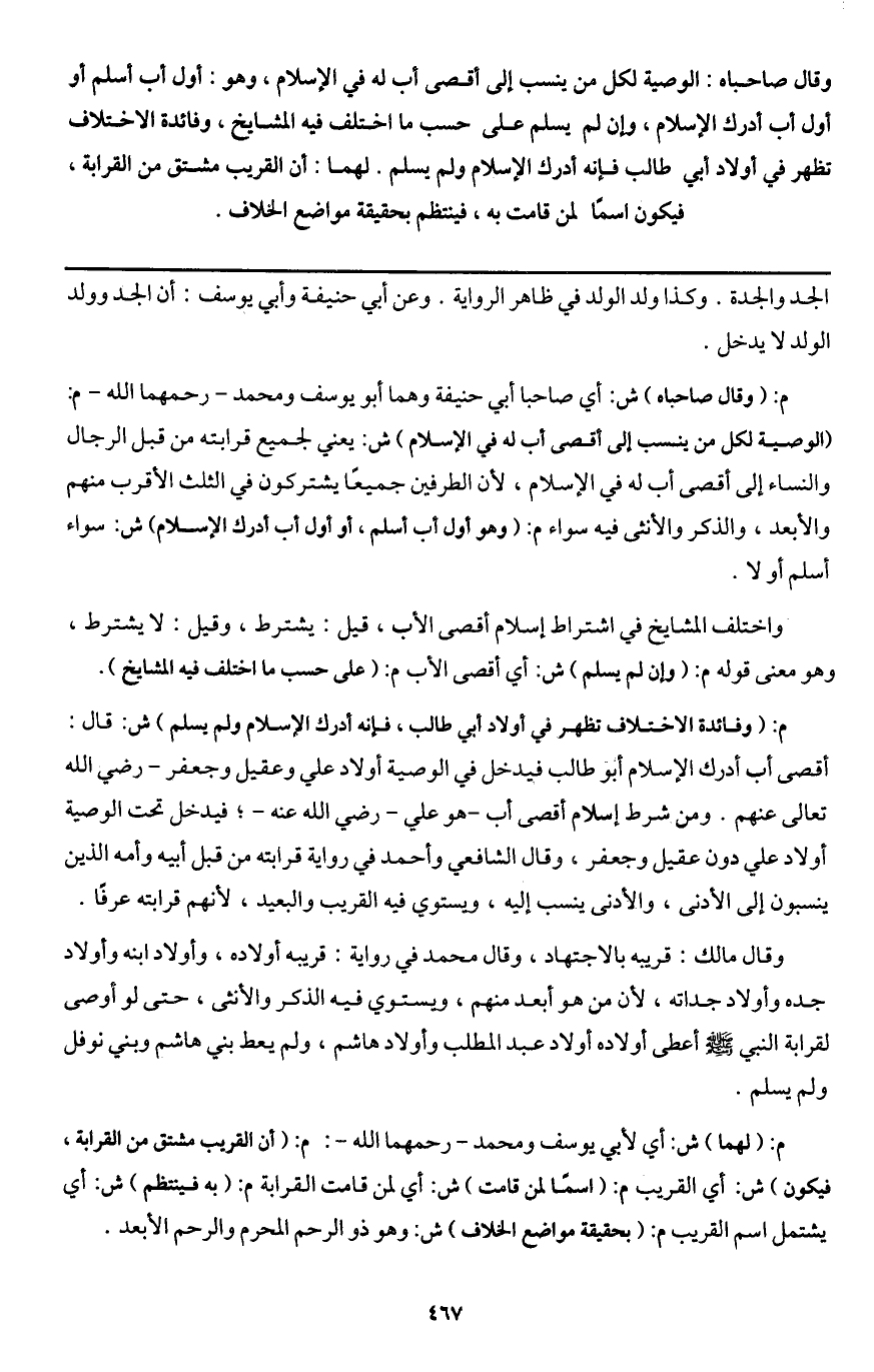 م: (وفائدة الاختلاف تظهر في أولاد أبي طالب، فإنه أدرك الإسلام ولم يسلم) ش: قال: أقصى أب أدرك الإسلام أبو طالب فيدخل في الوصية أولاد علي وعقيل وجعفر - رَضِيَ اللَّهُ تَعَالَى عَنْهُمْ -. ومن شرط إسلام أقصى أب - هو علي - رَضِيَ اللَّهُ عَنْهُ -.؛ فيدخل تحت الوصية أولاد علي دون عقيل وجعفر، وقال الشافعي وأحمد في رواية قرابته من قبل أبيه وأمه الذين ينسبون إلى الأدنى، والأدنى ينسب إليه، ويستوي فيه القريب والبعيد؛ لأنهم قرابته عرفا.