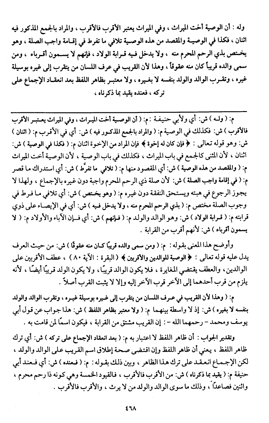 وله: أن الوصية أخت الميراث، وفي الميراث يعتبر الأقرب فالأقرب، والمراد بالجمع المذكور فيه اثنان، فكذا في الوصية والمقصد من هذه الوصية تلافي ما تفرط في إقامة واجب الصلة، وهو يختص بذي الرحم المحرم منه، ولا يدخل فيه قرابة الولاد، فإنهم لا يسمون أقرباء، ومن سمى والده قريبا كان منه عقوقا، وهذا لأن القريب في عرف اللسان من يتقرب إلى غيره بوسيلة غيره، وتقرب الوالد والولد بنفسه لا بغيره، ولا معتبر بظاهر اللفظ بعد انعقاد الإجماع على تركه، فعنده يقيد بما ذكرناه،