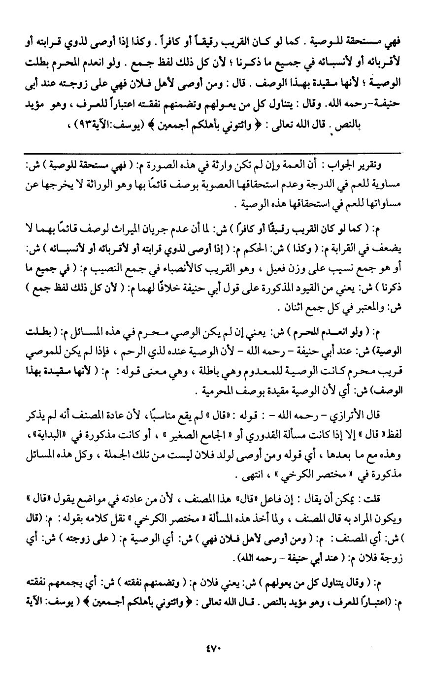 فهي مستحقة للوصية. كما لو كان القريب رقيقا أو كافرا. وكذا إذا أوصى لذوي قرابته أو لأقربائه أو لأنسبائه في جميع ما ذكرنا؛ لأن كل ذلك لفظ جمع. ولو انعدم المحرم بطلت الوصية؛ لأنها مقيدة بهذا الوصف. قال: ومن أوصى لأهل فلان فهي على زوجته عند أبي حنيفة - رَحِمَهُ اللَّهُ -. وقال: يتناول كل من يعولهم وتضمنهم نفقته اعتبارا للعرف، وهو مؤيد بالنص. قال الله تعالى: {وَأْتُونِي بِأَهْلِكُمْ أَجْمَعِينَ} [يوسف: 93] (يوسف: الآية 93) ،