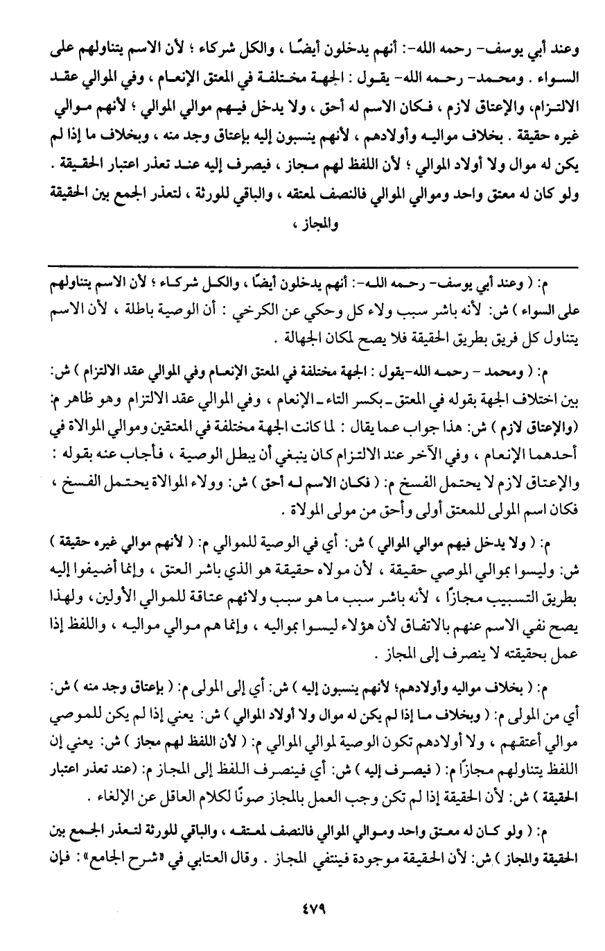 وعند أبي يوسف - رَحِمَهُ اللَّهُ -: أنهم يدخلون أيضا , والكل شركاء؛ لأن الاسم يتناولهم على السواء. ومحمد - رَحِمَهُ اللَّهُ - يقول: الجهة مختلفة في المعتق الإنعام , وفي الموالي عقد الالتزام، والإعتاق لازم، فكان الاسم له أحق، ولا يدخل فيهم موالي الموالي؛ لأنهم موالي غيره حقيقة. بخلاف مواليه وأولادهم؛ لأنهم ينسبون إليه بإعتاق وجد منه؛ وبخلاف ما إذا لم يكن له موال ولا أولاد الموالي؛ لأن اللفظ لهم مجاز , فيصرف إليه عند تعذر اعتبار الحقيقة. ولو كان له معتق واحد وموالي الموالي فالنصف لمعتقه، والباقي للورثة , لتعذر الجمع بين الحقيقة والمجاز،