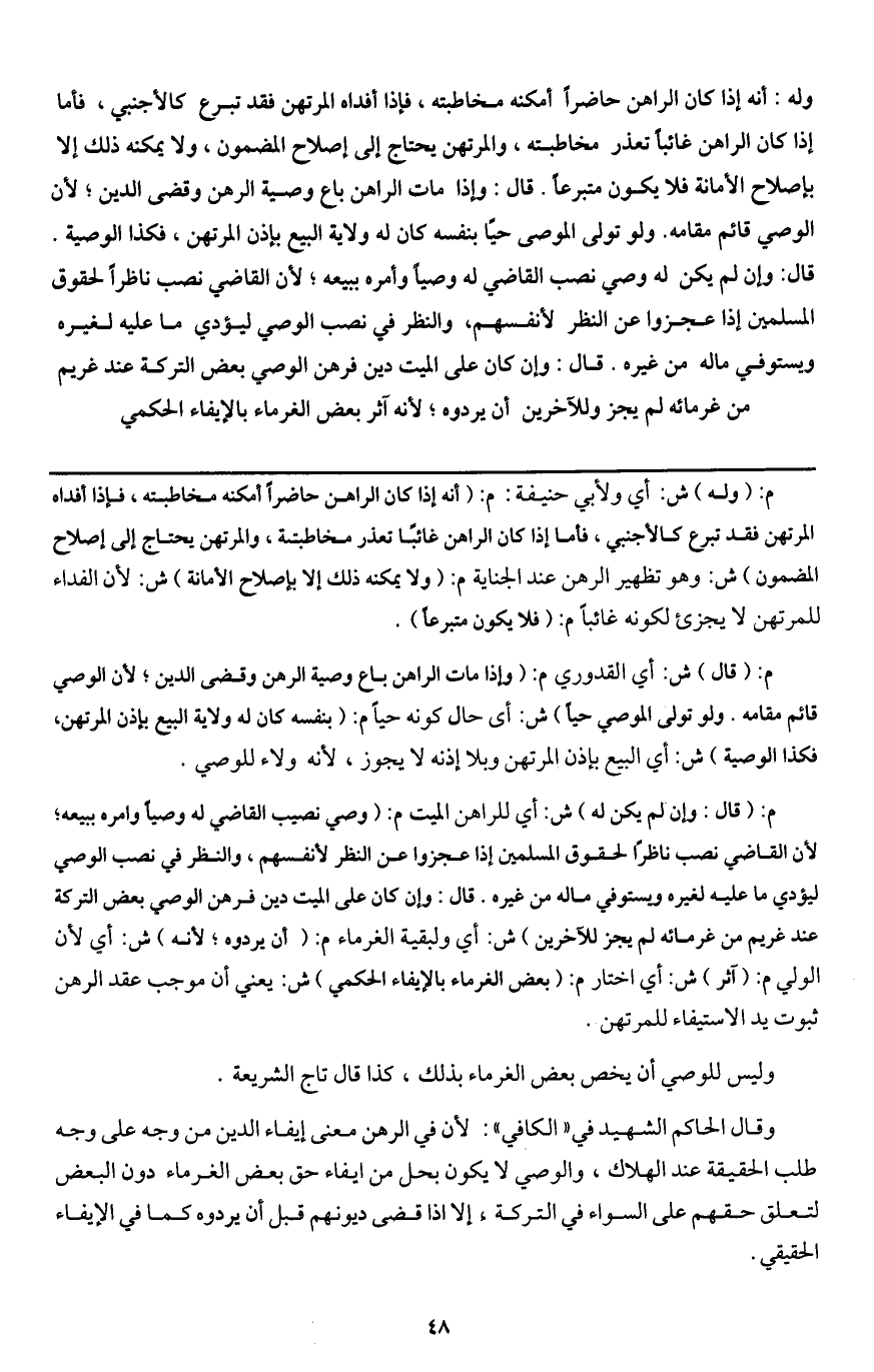 وقال الحاكم الشهيد في " الكافي ": لأن في الرهن معنى إيفاء الدين من وجه على وجه طلب الحقيقة عند الهلاك، والوصي لا يكون بحل من إيفاء حق بعض الغرماء دون البعض لتعلق حقهم على السواء في التركة، إلا إذا قضى ديونهم قبل أن يردوه كما في الإيفاء الحقيقي.
