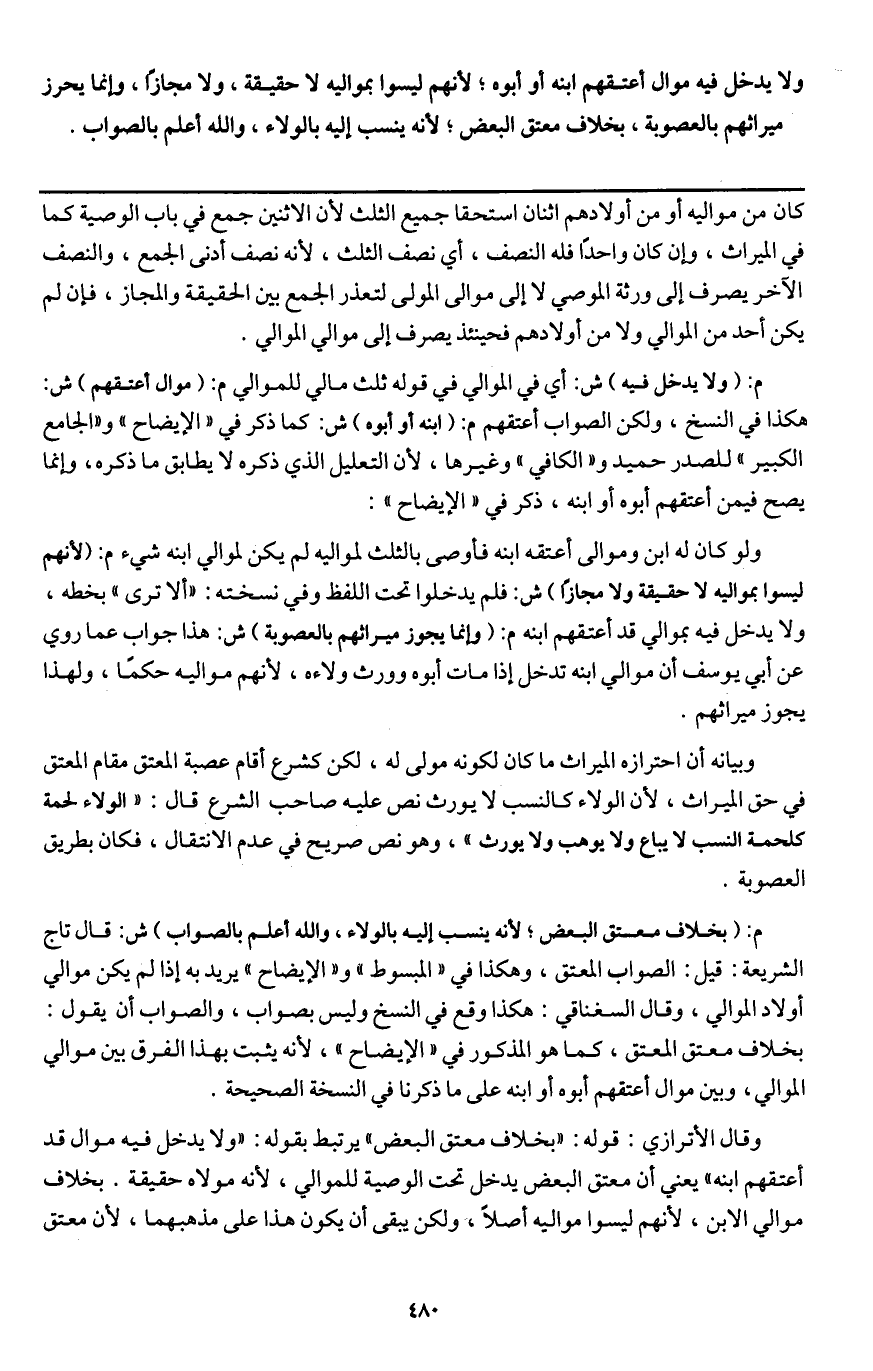 ولا يدخل فيه موال أعتقهم ابنه أو أبوه؛ لأنهم ليسوا بمواليه لا حقيقة، ولا مجازا، وإنما يحرز ميراثهم بالعصوبة، بخلاف معتق البعض؛ لأنه ينسب إليه بالولاء، والله أعلم بالصواب.