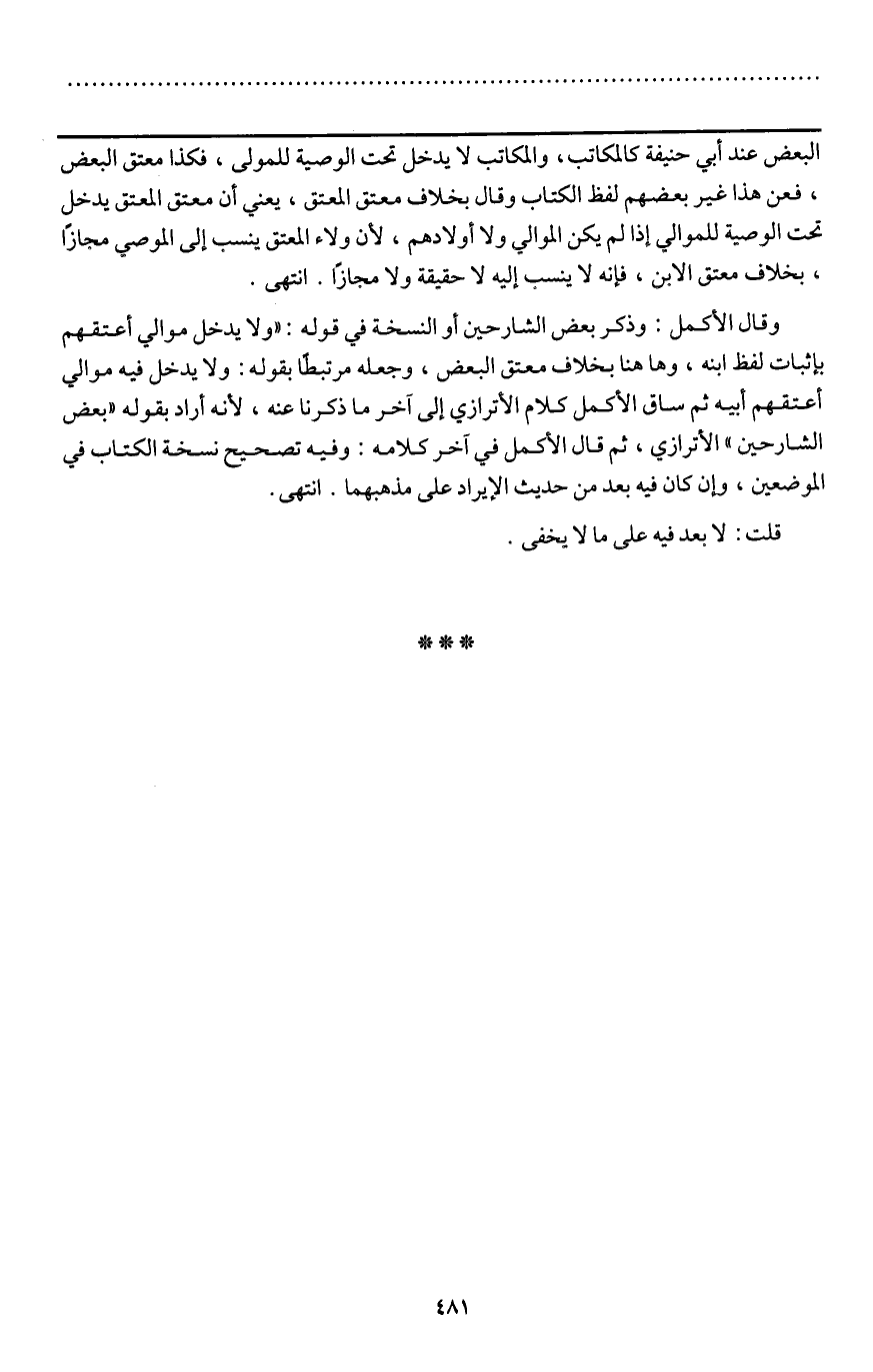 انتهى. وقال الأكمل: وذكر بعض الشارحين أو النسخة في قوله: " ولا يدخل موالي أعتقهم بإثبات لفظ ابنه وهاهنا بخلاف معتق البعض، وجعله مرتبطا بقوله: ولا يدخل فيه موالي أعتقهم أبيه ثم ساق الأكمل كلام الأترازي إلى آخر ما ذكرنا عنه؛ لأنه أراد بقوله " بعض الشارحين " الأترازي، ثم قال الأكمل في آخر كلامه: وفيه تصحيح نسخة الكتاب في الموضعين وإن كان فيه بعد من حديث الإيراد على مذهبهما. انتهى.