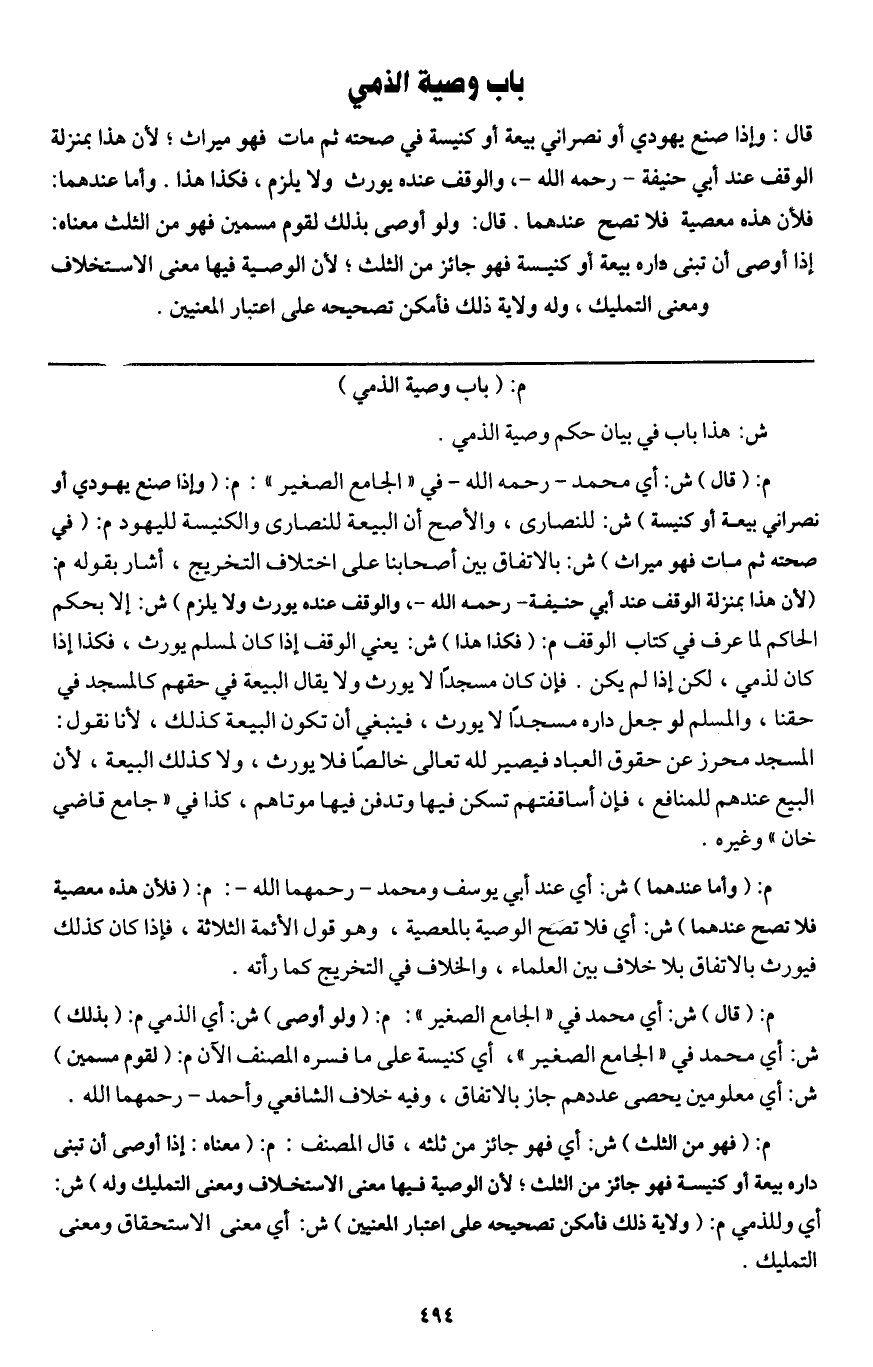 باب وصية الذمي قال: وإذا صنع يهودي أو نصراني بيعة أو كنيسة في صحته ثم مات فهو ميراث؛ لأن هذا بمنزلة الوقف عند أبي حنيفة - رَحِمَهُ اللَّهُ -، والوقف عنده يورث ولا يلزم، فكذا هذا. وأما عندهما: فلأن هذه معصية فلا تصح عندهما. قال: ولو أوصى بذلك لقوم مسمين فهو من الثلث معناه: إذا أوصى أن تبنى داره بيعة أو كنيسة فهو جائز من الثلث؛ لأن الوصية فيها معنى الاستخلاف ومعنى التمليك، وله ولاية ذلك فأمكن تصحيحه على اعتبار المعنيين.