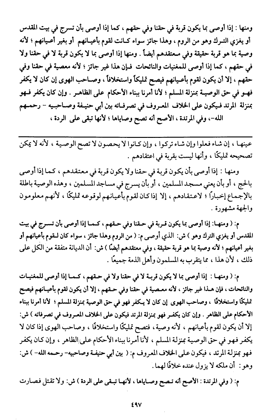 ومنها: إذا أوصى بما يكون قربة في حقنا وفي حقهم، كما إذا أوصى بأن تسرج في بيت المقدس أو يغزي الترك وهو من الروم، وهذا جائز سواء كانت لقوم بأعيانهم أو بغير أعيانهم؛ لأنه وصية بما هو قربة حقيقة وفي معتقدهم أيضا. ومنها إذا أوصى بما لا يكون قربة لا في حقنا ولا في حقهم، كما إذا أوصى للمغنيات والنائحات فإن هذا غير جائز؛ لأنه معصية في حقنا وفي حقهم، إلا أن يكون لقوم بأعيانهم فيصح تمليكا واستخلافا، وصاحب الهوى إن كان لا يكفر فهو في حق الوصية بمنزلة المسلم؛ لأنا أمرنا ببناء الأحكام على الظاهر. وإن كان يكفر فهو بمنزلة المرتد فيكون على الخلاف المعروف في تصرفاته بين أبي حنيفة وصاحبيه - رَحِمَهُمُ اللَّهُ -، وفي المرتدة، الأصح أنه تصح وصاياها؛ لأنها تبقى على الردة،