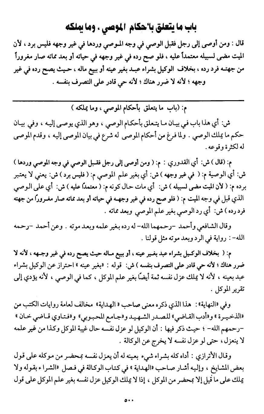 باب ما يتعلق بأحكام الموصي وما يملكه قال: ومن أوصى إلى رجل فقبل الوصي في وجه الموصي وردها في غير وجهه فليس برد؛ لأن الميت مضى لسبيله معتمدا عليه، فلو صح رده، في غير وجهه في حياته أو بعد مماته صار مغرورا من جهته فرد رده، بخلاف الوكيل بشراء عبد بغير عينه أو ببيع ماله، حيث يصح رده في غير وجهه؛ لأنه لا ضرر هناك؛ لأنه حي قادر على التصرف بنفسه.