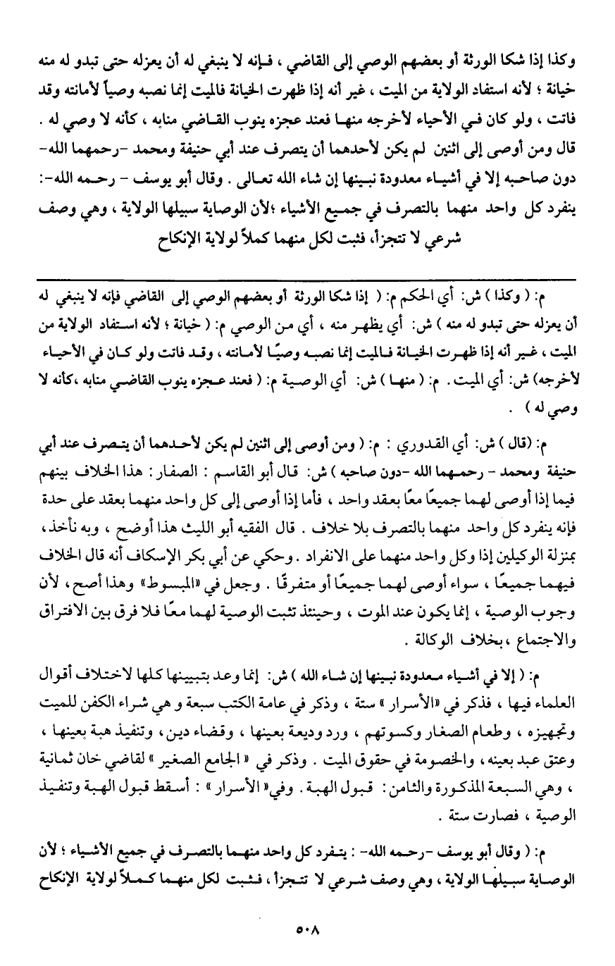 وكذا إذا شكا الورثة أو بعضهم الوصي إلى القاضي، فإنه لا ينبغي له أن يعزله حتى تبدو له منه خيانة، لأنه استفاد الولاية من الميت، غير أنه إذا ظهرت الخيانة فالميت إنما نصبه وصيا لأمانته وقد فاتت، ولو كان في الأحياء لأخرجه منها فعند عجزه ينوب القاضي منابه، كأنه لا وصي له. قال ومن أوصى إلى اثنين لم يكن لأحدهما أن يتصرف عند أبي حنيفة ومحمد - رحمهما الله - دون صاحبه إلا في أشياء معدودة نبينها إن شاء الله تعالى. وقال أبو يوسف - رَحِمَهُ اللَّهُ -: ينفرد كل واحد منهما بالتصرف في جميع الأشياء؛ لأن الوصاية سبيلها الولاية، وهي وصف شرعي لا تتجزأ، فثبت لكل منهما كملا لولاية الإنكاح