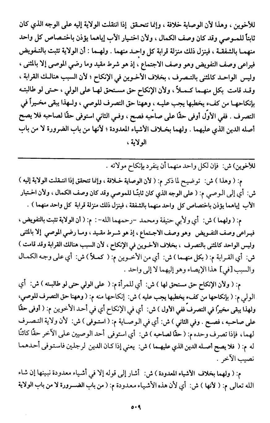 للأخوين، وهذا لأن الوصاية خلافة، وإنما تتحقق إذا انتقلت الولاية إليه على الوجه الذي كان ثابتا للموصي وقد كان وصف الكمال، ولأن اختيار الأب إياهما يؤذن باختصاص كل واحد منهما بالشفقة، فينزل ذلك منزلة قرابة كل واحد منهما. ولهما: أن الولاية تثبت بالتفويض فيراعى وصف التفويض وهو وصف الاجتماع، إذ هو شرط مقيد وما رضي الموصى إلا بالمثنى، وليس الواحد كالمثنى بالتصرف، بخلاف الأخوين في الإنكاح؛ لأن السبب هنالك القرابة، وقد قامت بكل منهما كملا، ولأن الإنكاح حق مستحق لها على الولي، حتى لو طالبته بإنكاحها من كفء يخطبها يجب عليه، وهاهنا حق التصرف للوصي، ولهذا يبقى مخيرا في التصرف. ففي الأول أوفى حقا على صاحبه فصح، وفي الثاني استوفى حقا لصاحبه فلا يصح أصله الدين الذي عليهما. ولهما بخلاف الأشياء المعدودة؛ لأنها من باب الضرورة لا من باب الولاية،