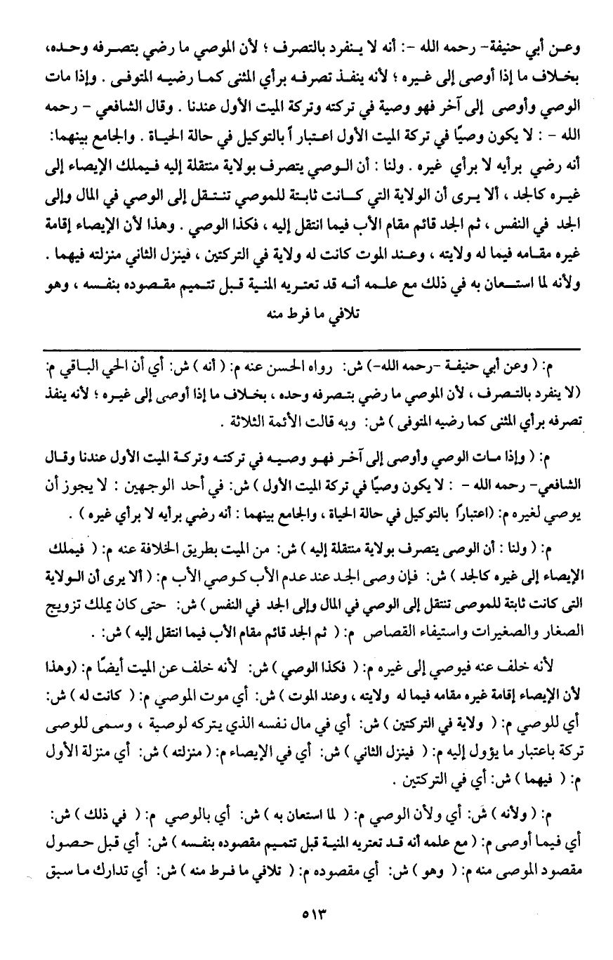 وعن أبي حنيفة - رَحِمَهُ اللَّهُ -: أنه لا ينفرد بالتصرف؛ لأن الموصي ما رضي بتصرفه وحده، بخلاف ما إذا أوصى إلى غيره؛ لأنه ينفذ تصرفه برأي المثنى كما رضيه المتوفى. وإذا مات الوصي وأوصى إلى آخر فهو وصية في تركته وتركة الميت الأول عندنا. وقال الشافعي - رَحِمَهُ اللَّهُ -: لا يكون وصيا في تركة الميت الأول اعتبارا بالتوكيل في حالة الحياة. والجامع بينهما: أنه رضي برأيه لا برأي غيره. ولنا: أن الوصي يتصرف بولاية منتقلة إليه فيملك الإيصاء إلى غيره كالجد، ألا يرى أن الولاية التي كانت ثابتة للموصي تنتقل إلى الوصي في المال وإلى الجد في النفس، ثم الجد قائم مقام الأب فيما انتقل إليه، فكذا الوصي. وهذا لأن الإيصاء إقامة غيره مقامه فيما له ولايته، وعند الموت كانت له ولاية في التركتين، فينزل الثاني منزلته فيهما. ولأنه لما استعان به في ذلك مع علمه أنه قد تعتريه المنية قبل تتميم مقصوده بنفسه، وهو تلافي ما فرط منه