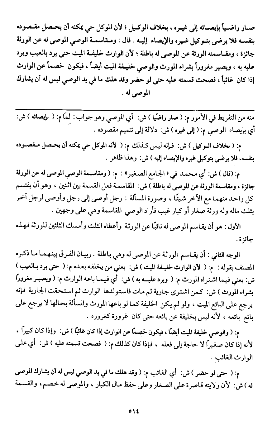 صار راضيا بإيصائه إلى غيره، بخلاف الوكيل؛ لأن الموكل حي يمكنه أن يحصل مقصوده بنفسه فلا يرضى بتوكيل غيره والإيصاء إليه. قال: ومقاسمة الوصي الموصى له عن الورثة جائزة، ومقاسمته الورثة عن الموصى له باطلة؛ لأن الوارث خليفة الميت حتى يرد بالعيب ويرد عليه به، ويصير مغرورا بشراء المورث والوصي خليفة الميت أيضا، فيكون خصما عن الوارث إذا كان غائبا، فصحت قسمته عليه حتى لو حضر وقد هلك ما في يد الوصي ليس له أن يشارك الموصى له.