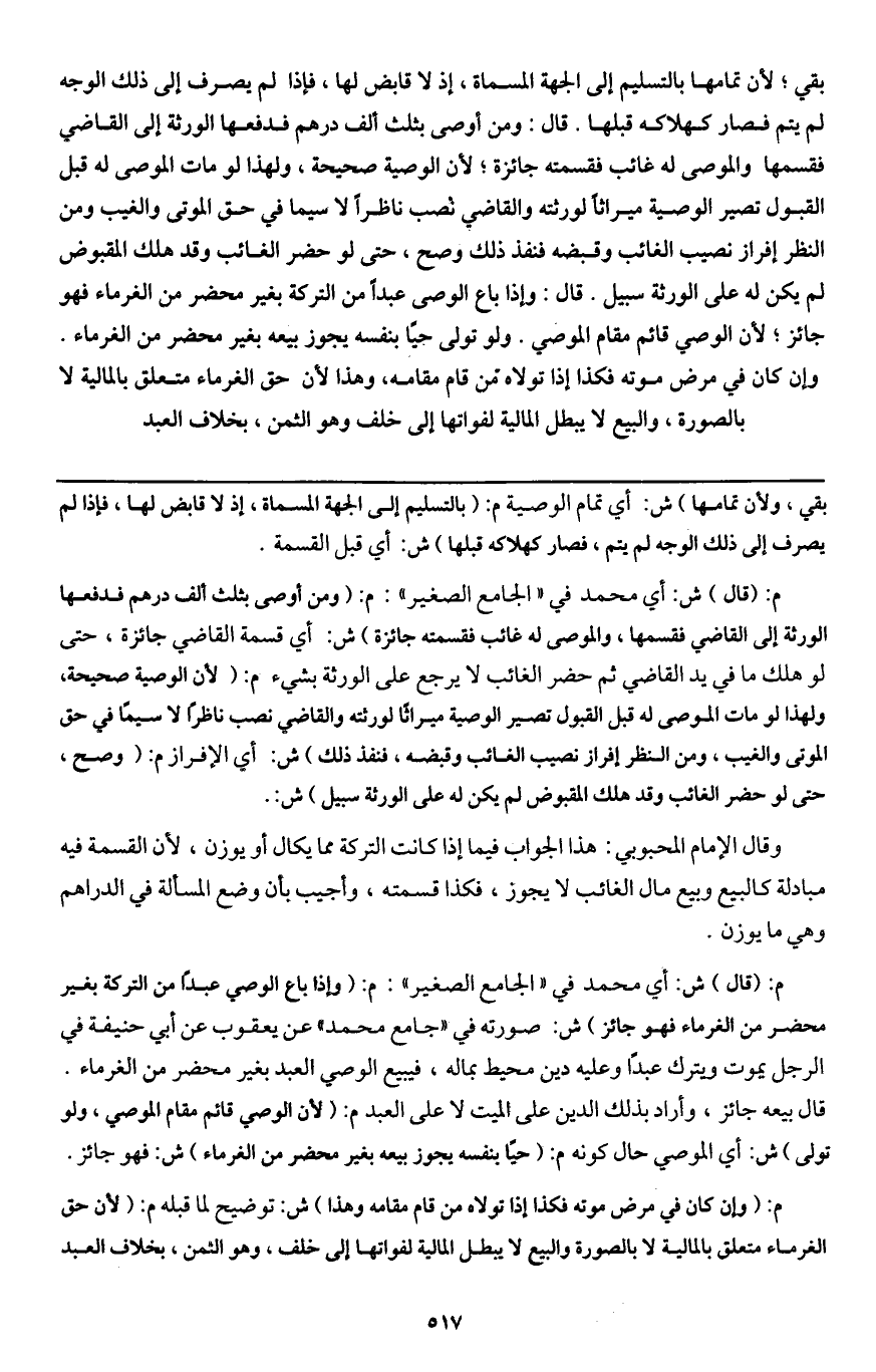 بقي؛ لأن تمامها بالتسليم إلى الجهة المسماة، إذ لا قابض لها، فإذا لم يصرف إلى ذلك الوجه لم يتم فصار كهلاكه قبلها. قال: ومن أوصى بثلث ألف درهم فدفعها الورثة إلى القاضي فقسمها والموصى له غائب فقسمته جائزة؛ لأن الوصية صحيحة، ولهذا لو مات الموصى له قبل القبول تصير الوصية ميراثا لورثته والقاضي نصب ناظرا لا سيما في حق الموتى والغيب ومن النظر إفراز نصيب الغائب وقبضه فنفذ ذلك وصح، حتى لو حضر الغائب وقد هلك المقبوض لم يكن له على الورثة سبيل. قال: وإذا باع الوصي عبدا من التركة بغير محضر من الغرماء فهو جائز؛ لأن الوصي قائم مقام الموصي. ولو تولى حيا بنفسه يجوز بيعه بغير محضر من الغرماء. وإن كان في مرض موته فكذا إذا تولاه من قام مقامه، وهذا لأن حق الغرماء متعلق بالمالية لا بالصورة، والبيع لا يبطل المالية لفواتها إلى خلف وهو الثمن، بخلاف العبد