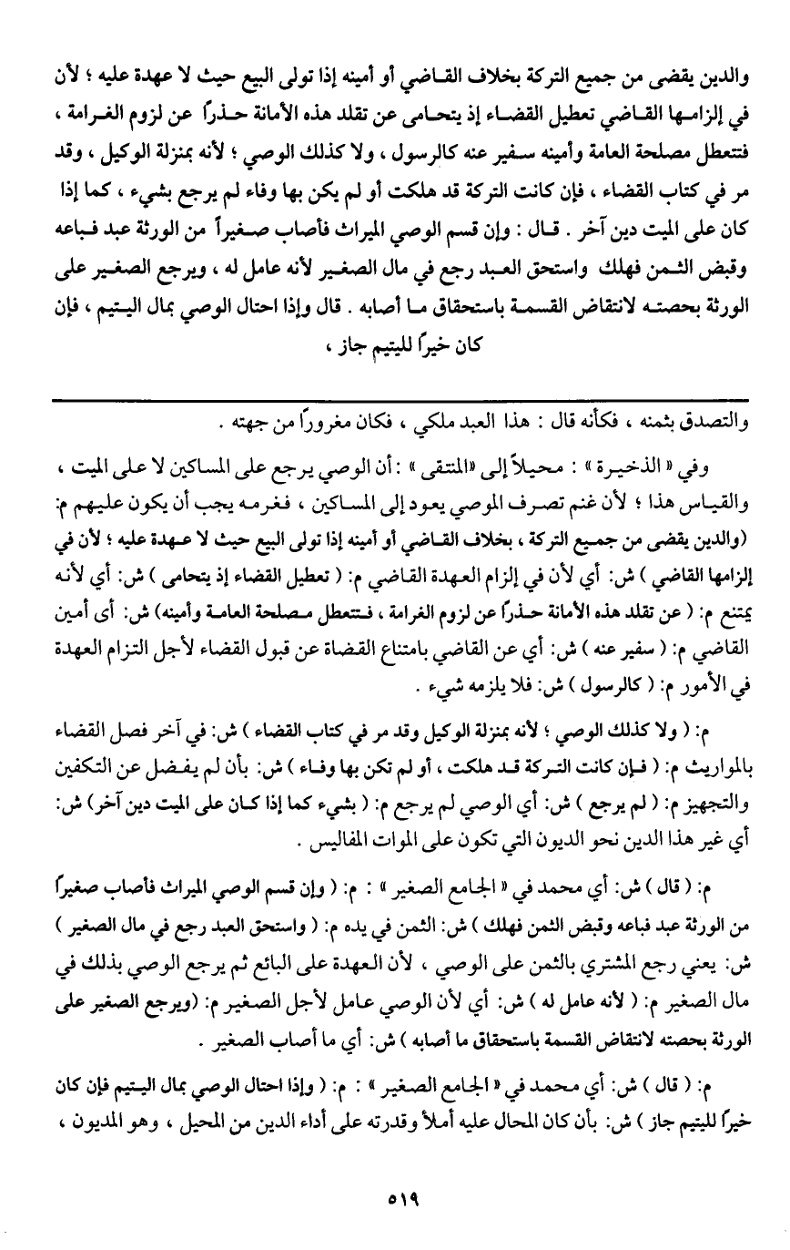 وفي " الذخيرة ": محيلا إلى " المنتقى ": أن الوصي يرجع على المساكين لا على الميت، والقياس هذا؛ لأن غنم تصرف الموصي يعود إلى المساكين، فغرمه يجب أن يكون عليهم م: (والدين يقضى من جميع التركة، بخلاف القاضي أو أمينه إذا تولى البيع حيث لا عهدة عليه؛ لأن في إلزامها القاضي) ش: أي لأن في إلزام العهدة القاضي م: (تعطيل القضاء إذ يتحامى) ش: أي لأنه يمتنع م: (عن تقلد هذه الأمانة حذرا عن لزوم الغرامة، فتتعطل مصلحة العامة وأمينه) ش: أي أمين القاضي م: (سفير عنه) ش: أي عن القاضي بامتناع القضاة عن قبول القضاء لأجل التزام العهدة في الأمور م: (كالرسول) ش: فلا يلزمه شيء.