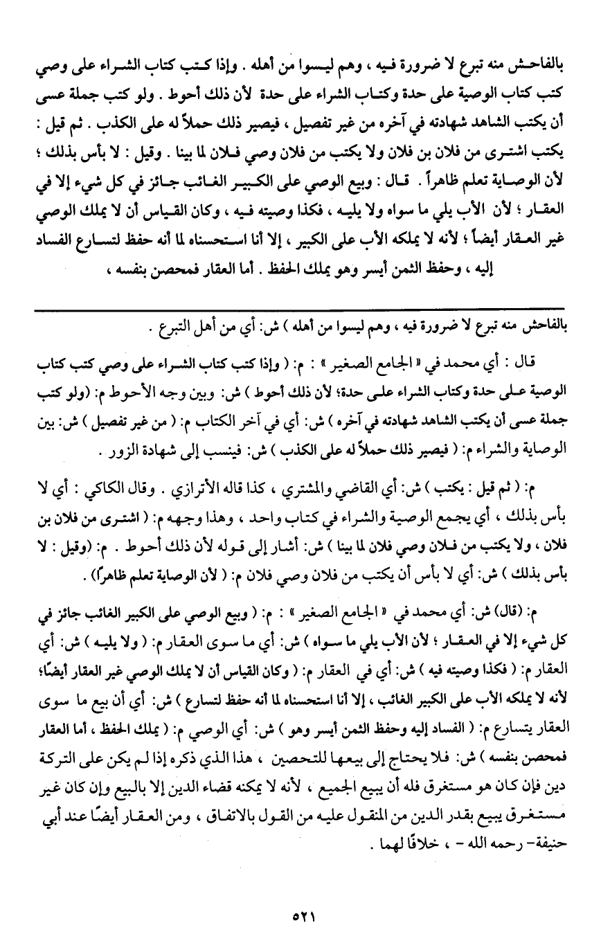 بالفاحش منه تبرع لا ضرورة فيه، وهم ليسوا من أهله. وإذا كتب كتاب الشراء على وصي كتب كتاب الوصية على حدة وكتاب الشراء على حدة لأن ذلك أحوط. ولو كتب جملة عسى أن يكتب الشاهد شهادته في آخره من غير تفصيل، فيصير ذلك حملا له على الكذب. ثم قيل: يكتب اشترى من فلان ابن فلان ولا يكتب من فلان وصي فلان لما بينا. وقيل: لا بأس بذلك؛ لأن الوصاية تعلم ظاهرا. قال: وبيع الوصي على الكبير الغائب جائز في كل شيء إلا في العقار؛ لأن الأب يلي ما سواه ولا يليه، فكذا وصيته فيه، وكان القياس أن لا يملك الوصي غير العقار أيضا؛ لأنه لا يملكه الأب على الكبير، إلا أنا استحسناه لما أنه حفظ لتسارع الفساد إليه وحفظ الثمن أيسر وهو يملك الحفظ. أما العقار فمحصن بنفسه،