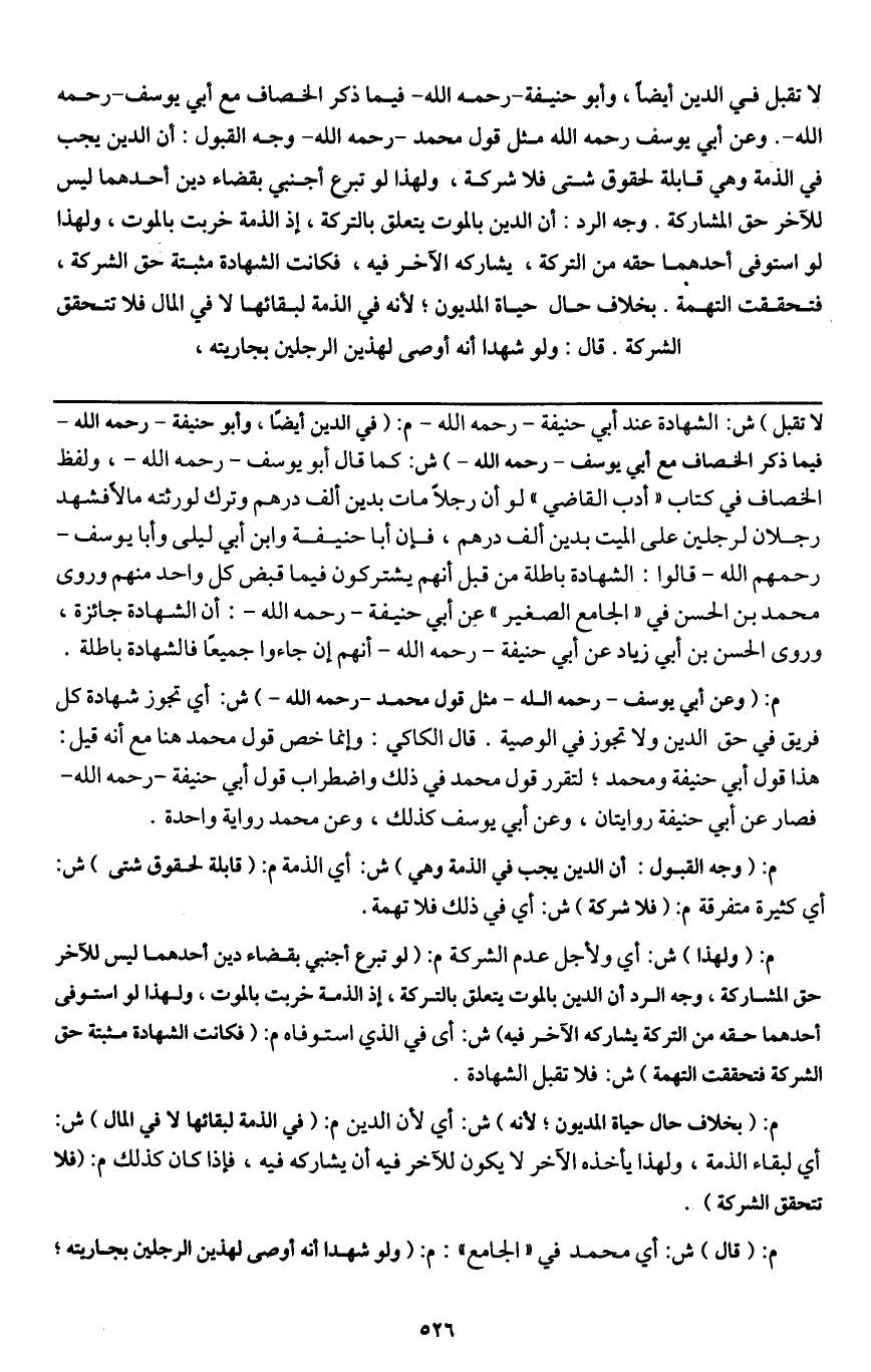 لا تقبل في الدين أيضا، وأبو حنيفة - رَحِمَهُ اللَّهُ - فيما ذكر الخصاف مع أبي يوسف - رَحِمَهُ اللَّهُ -. وعن أبي يوسف - رَحِمَهُ اللَّهُ - مثل قول محمد - رَحِمَهُ اللَّهُ - وجه القبول: أن الدين يجب في الذمة وهي قابلة لحقوق شتى فلا شركة، ولهذا لو تبرع أجنبي بقضاء دين أحدهما ليس للآخر حق المشاركة. وجه الرد: أن الدين بالموت يتعلق بالتركة، إذ الذمة خربت بالموت، ولهذا لو استوفى أحدهما حقه من التركة، يشاركه الآخر فيه، فكانت الشهادة مثبتة حق الشركة، فتحققت التهمة. بخلاف حال حياة المديون؛ لأنه في الذمة لبقائها لا في المال فلا تتحقق الشركة. قال: ولو شهدا أنه أوصى لهذين الرجلين بجاريته،