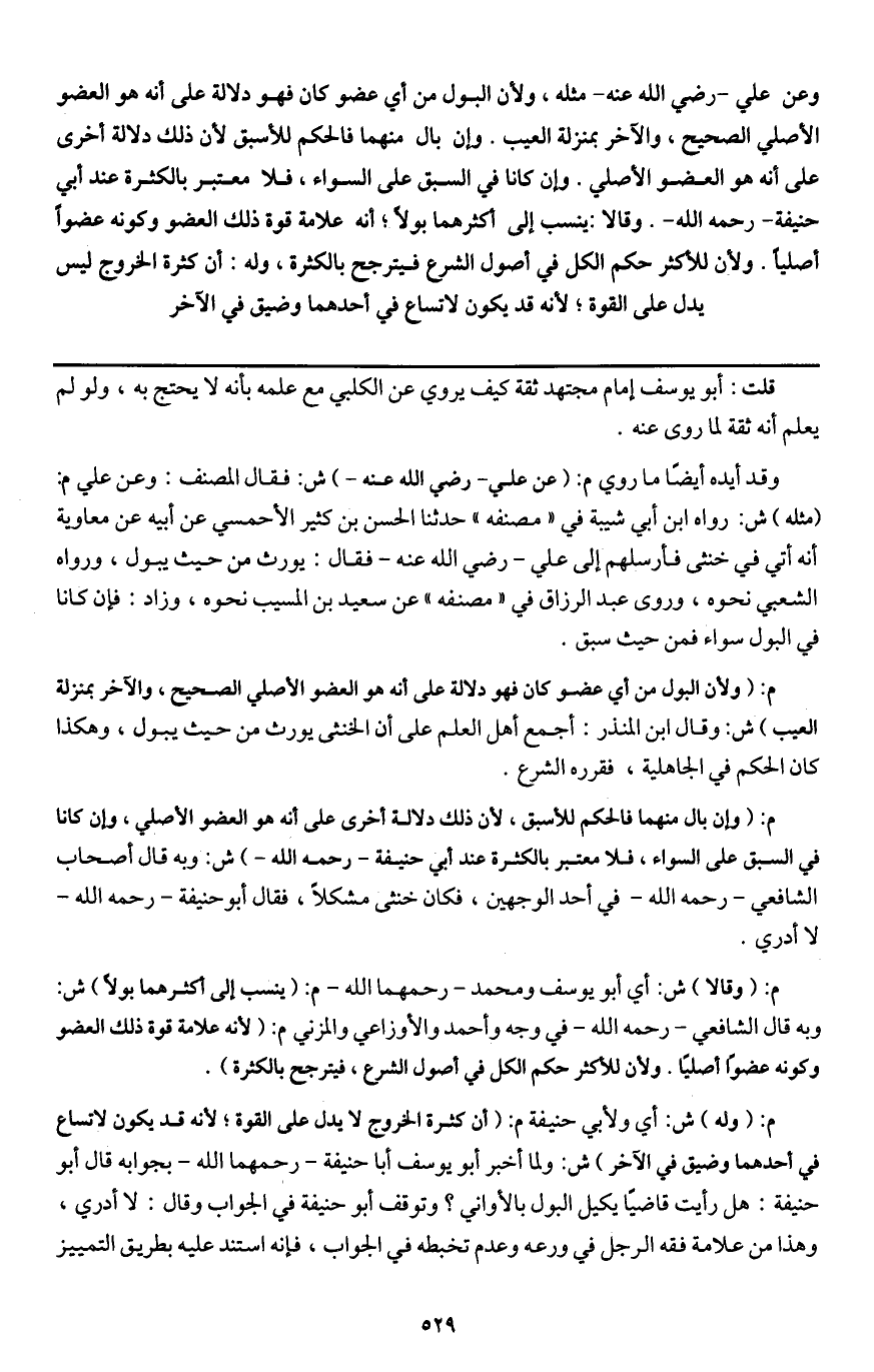 وعن علي - رَضِيَ اللَّهُ عَنْهُ - مثله، ولأن البول من أي عضو كان فهو دلالة على أنه هو العضو الأصلي الصحيح، والآخر بمنزلة العيب. وإن بال منهما فالحكم للأسبق لأن ذلك دلالة أخرى على أنه هو العضو الأصلي. وإن كانا في السبق على السواء، فلا معتبر بالكثرة عند أبي حنيفة - رَحِمَهُ اللَّهُ -. وقالا: ينسب إلى أكثرهما بولا؛ أنه علامة قوة ذلك العضو وكونه عضوا أصليا. ولأن للأكثر حكم الكل في أصول الشرع فيترجح بالكثرة، وله: أن كثرة الخروج ليس يدل على القوة؛ لأنه قد يكون لاتساع في أحدهما وضيق في الآخر