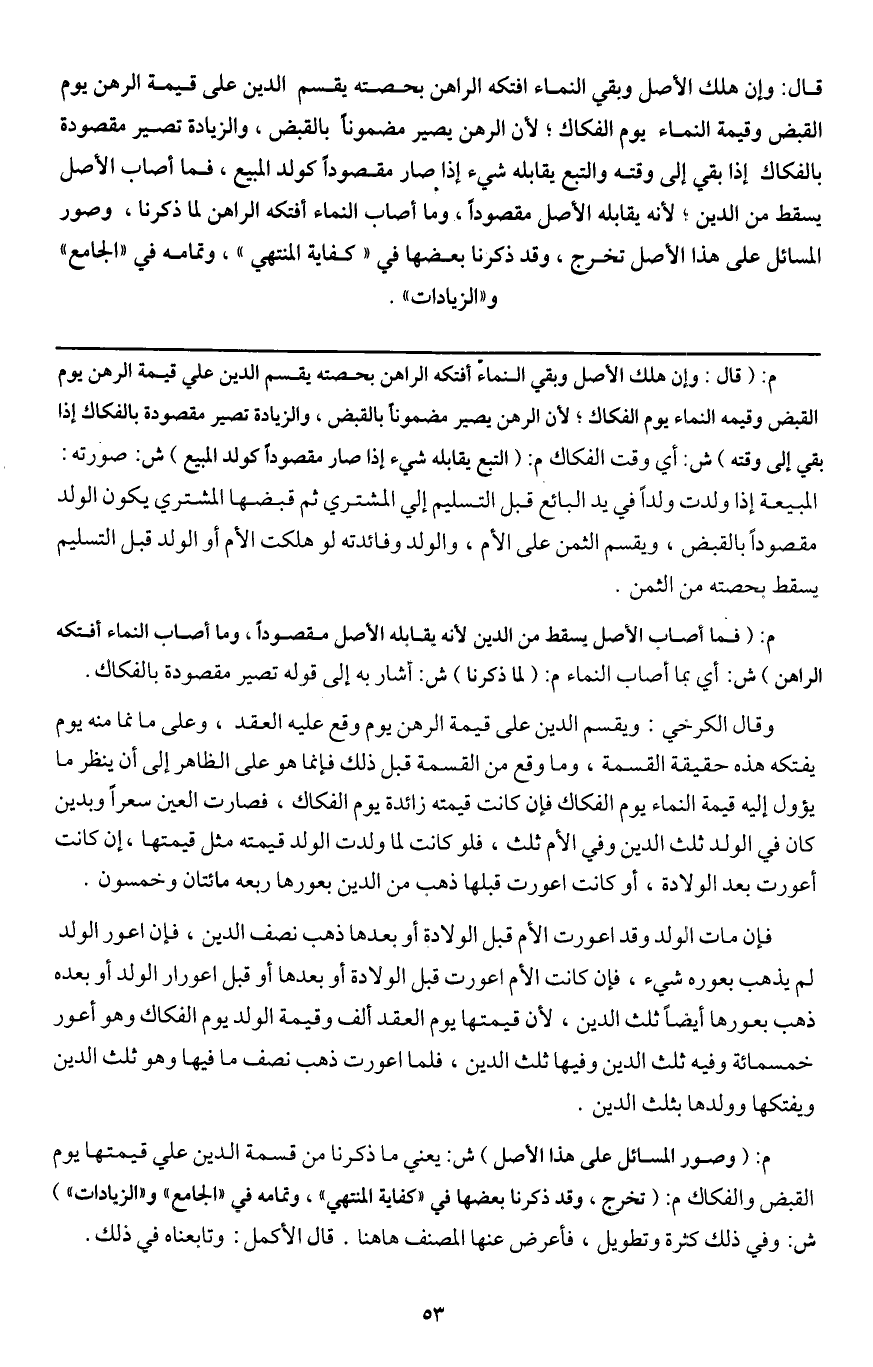 وقال الكرخي: ويقسم الدين على قيمة الرهن يوم وقع عليه العقد، وعلى ما نما منه يوم يفتكه هذه حقيقة القسمة، وما وقع من القسمة قبل ذلك فإنما هو على الظاهر إلى أن ينظر ما يؤول إليه قيمة النماء يوم الفكاك فإن كانت قيمته زائدة يوم الفكاك، فصارت العين سعرا وبدين كان في الولد ثلث الدين وفي الأم ثلث، فلو كانت لما ولدت الولد قيمته مثل قيمتها، إن كانت اعورت بعد الولادة، أو كانت اعورت قبلها ذهب من الدين بعورها ربعه مائتان وخمسون.