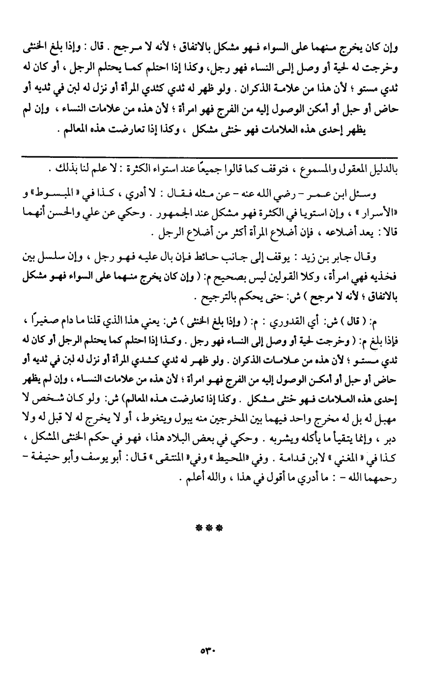 وإن كان يخرج منهما على السواء فهو مشكل بالاتفاق؛ لأنه لا مرجح. قال: وإذا بلغ الخنثى وخرجت له لحية أو وصل إلى النساء فهو رجل، وكذا إذا احتلم كما يحتلم الرجل، أو كان له ثدي مستو؛ لأن هذا من علامة الذكران. ولو ظهر له ثدي كثدي المرأة أو نزل له لبن في ثديه أو حاض أو حبل أو أمكن الوصول إليه من الفرج فهو امرأة؛ لأن هذه من علامات النساء، وإن لم يظهر إحدى هذه العلامات فهو خنثى مشكل، وكذا إذا تعارضت هذه المعالم.