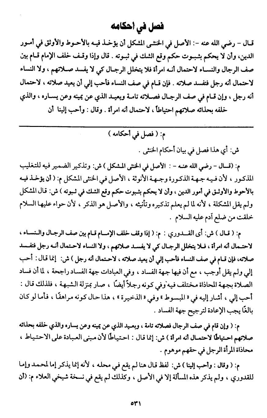 فصل في أحكامه قال - رَضِيَ اللَّهُ عَنْهُ -: الأصل في الخنثى المشكل أن يؤخذ فيه بالأحوط والأوثق في أمور الدين، وأن لا يحكم بثبوت حكم وقع الشك في ثبوته. قال: وإذا وقف خلف الإمام قام بين صف الرجال والنساء لاحتمال أنه امرأة فلا يتخلل الرجال كي لا يفسد صلاتهم، ولا النساء لاحتمال أنه رجل فتفسد صلاته. فإن قام في صف النساء فأحب إلي أن يعيد صلاته، لاحتمال أنه رجل، وإن قام في صف الرجال فصلاته تامة ويعيد الذي عن يمينه وعن يساره، والذي خلفه بحذائه صلاتهم احتياطا، لاحتمال أنه امرأة. وقال: وأحب إلينا أن