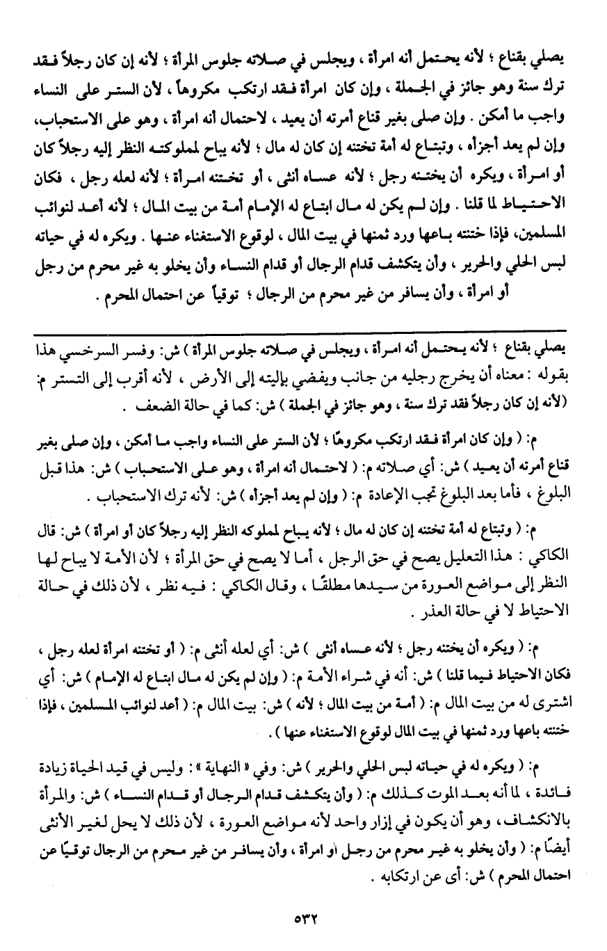 يصلي بقناع؛ لأنه يحتمل أنه امرأة، ويجلس في صلاته جلوس المرأة؛ لأنه إن كان رجلا فقد ترك سنة وهو جائز في الجملة، وإن كان امرأة فقد ارتكب مكروها؛ لأن الستر على النساء واجب ما أمكن. وإن صلى بغير قناع أمرته أن يعيد، لاحتمال أنه امرأة، وهو على الاستحباب، وإن لم يعد أجزأه، وتبتاع له أمة تختنه إن كان له مال؛ لأنه يباح لمملوكته النظر إليه رجلا كان أو امرأة، ويكره أن يختنه رجل؛ لأنه عساه أنثى، أو تختنه امرأة؛ لأنه لعله رجل، فكان الاحتياط لما قلنا. وإن لم يكن له مال ابتاع له الإمام أمة من بيت المال؛ لأنه أعد لنوائب المسلمين، فإذا ختنته باعها ورد ثمنها في بيت المال، لوقوع الاستغناء عنها. ويكره له في حياته لبس الحلي والحرير، وأن يتكشف قدام الرجال أو قدام النساء وأن يخلو به غير محرم من رجل أو امرأة، وأن يسافر من غير محرم من الرجال؛ توقيا عن احتمال المحرم.