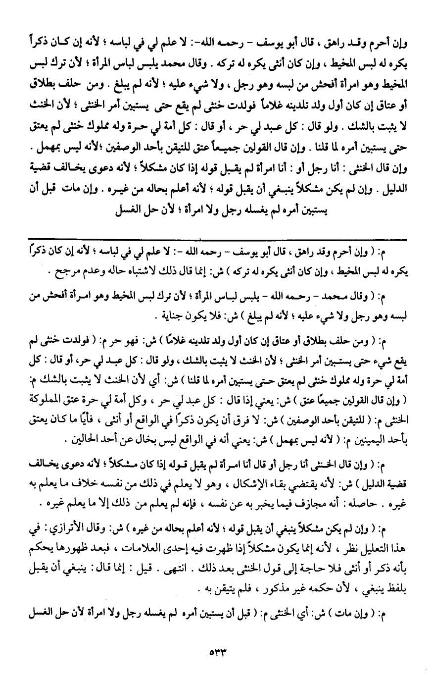 وإن أحرم وقد راهق، قال أبو يوسف - رَحِمَهُ اللَّهُ -: لا علم لي في لباسه؛ لأنه إن كان ذكرا يكره له لبس المخيط، وإن كان أنثى يكره له تركه. وقال محمد يلبس لباس المرأة؛ لأن ترك لبس المخيط وهو امرأة أفحش من لبسه وهو رجل، ولا شيء عليه؛ لأنه لم يبلغ. ومن حلف بطلاق أو عتاق إن كان أول ولد تلدينه غلاما فولدت خنثى لم يقع حتى يستبين أمر الخنثى؛ لأن الخنث لا يثبت بالشك. ولو قال: كل عبد لي حر، أو قال: كل أمة لي حرة وله مملوك خنثى لم يعتق حتى يستبين أمره لما قلنا. وإن قال القولين جميعا عتق للتيقن بأحد الوصفين؛ لأنه ليس بمهمل. وإن قال الخنثى: أنا رجل أو أنا امرأة لم يقبل قوله إذا كان مشكلا؛ لأنه دعوى يخالف قضية الدليل. وإن لم يكن مشكلا ينبغي أن يقبل قوله؛ لأنه أعلم بحاله من غيره. وإن مات قبل أن يستبين أمره لم يغسله رجل ولا امرأة؛ لأن حل الغسل