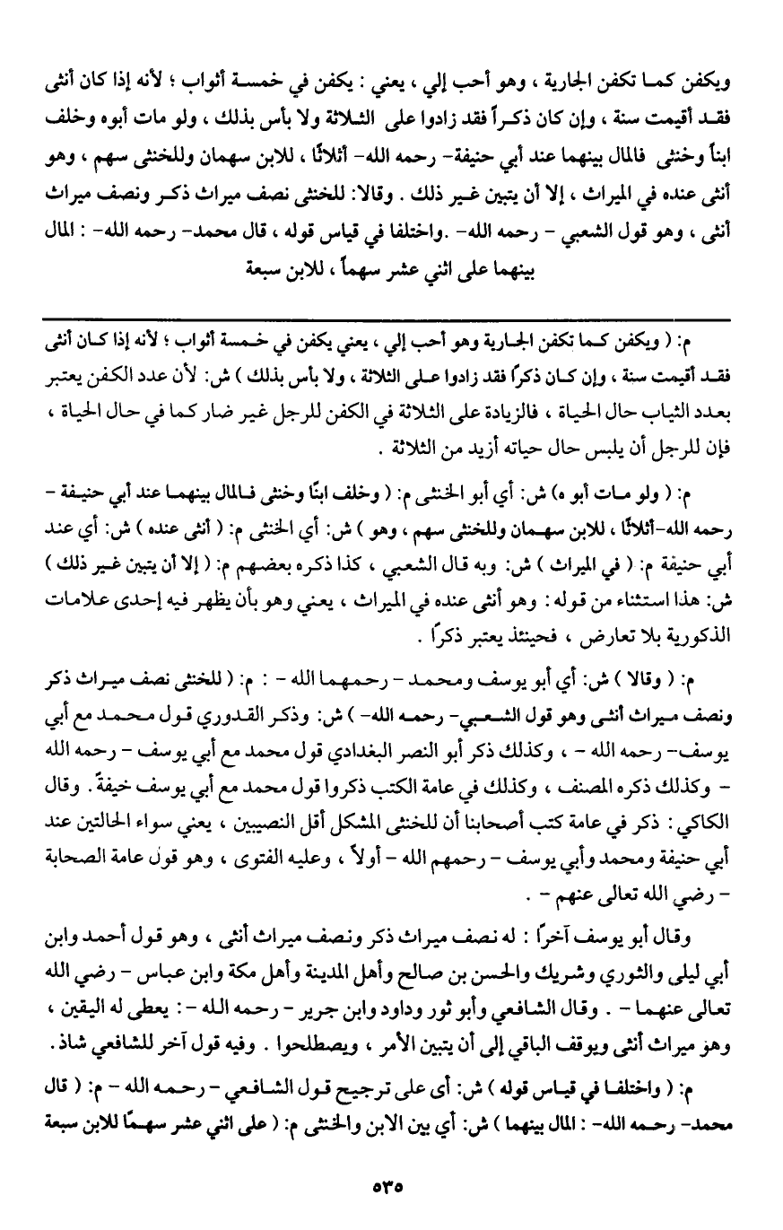 ويكفن كما تكفن الجارية، وهو أحب إلي، يعني: يكفن في خمسة أثواب؛ لأنه إذا كان أنثى فقد أقيمت سنة، وإن كان ذكرا فقد زادوا على الثلاثة ولا بأس بذلك، ولو مات أبوه وخلف ابنا وخنثى فالمال بينهما عند أبي حنيفة - رَحِمَهُ اللَّهُ - أثلاثا، للابن سهمان وللخنثى سهم، وهو أنثى عنده في الميراث، إلا أن يتبين غير ذلك. وقالا: للخنثى نصف ميراث ذكر ونصف ميراث أنثى، وهو قول الشعبي - رَحِمَهُ اللَّهُ -. واختلفا في قياس قوله، قال محمد - رَحِمَهُ اللَّهُ -: المال بينهما على اثني عشر سهما، للابن سبعة