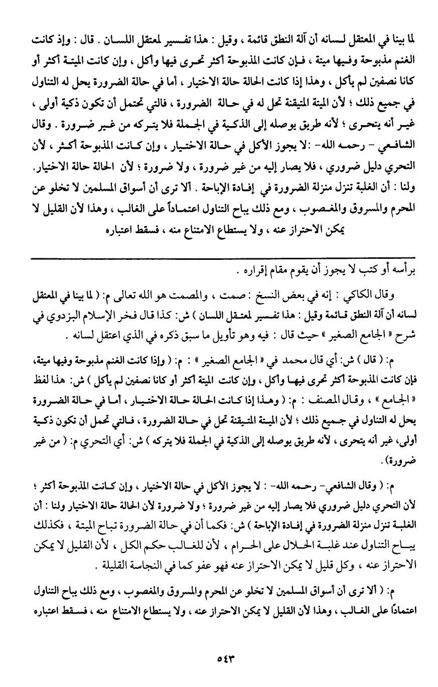 لما بينا في المعتقل لسانه أن آلة النطق قائمة، وقيل: هذا تفسير لمعتقل اللسان. قال: وإذا كانت الغنم مذبوحة وفيها ميتة، فإن كانت المذبوحة أكثر تحرى فيها وأكل، وإن كانت الميتة أكثر أو كانا نصفين لم يأكل وهذا إذا كانت الحالة حالة الاختيار، أما في حالة الضرورة يحل له التناول في جميع ذلك؛ لأن الميتة المتيقنة تحل له في حالة الضرورة فالتي تحتمل أن تكون ذكية أولى، غير أنه يتحرى؛ لأنه طريق يوصله إلى الذكية في الجملة فلا يتركه من غير ضرورة. وقال الشافعي - رَحِمَهُ اللَّهُ -: لا يجوز الأكل في حالة الاختيار، وإن كانت المذبوحة أكثر؛ لأن التحري دليل ضروري، فلا يصار إليه من غير ضرورة، ولا ضرورة؛ لأن الحالة حالة الاختيار. ولنا: أن الغلبة تنزل منزلة الضرورة في إفادة الإباحة. ألا ترى أن أسواق المسلمين لا تخلو عن المحرم والمسروق والمغصوب، ومع ذلك يباح التناول اعتمادا على الغالب، وهذا لأن القليل لا يمكن الاحتراز عنه، ولا يستطاع الامتناع منه، فسقط اعتباره