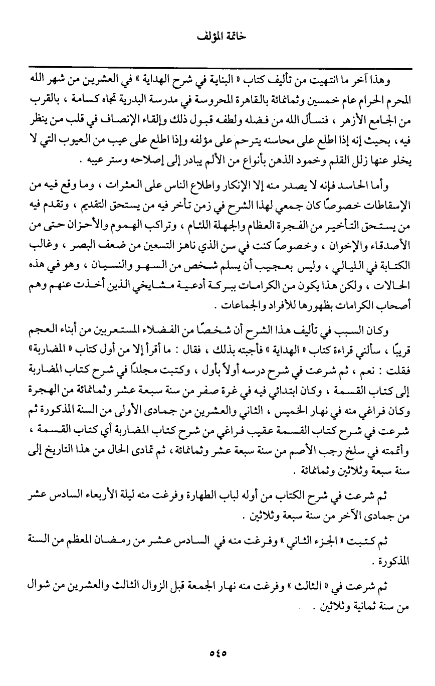 ـــــــــــــــــــــــــــــQوهذا آخر ما انتهيت من تأليف كتاب " البناية في شرح الهداية " في العشرين من شهر الله المحرم الحرام عام خمسين وثمانمائة بالقاهرة المحروسة في مدرسة البدرية تجاه كسامة، بالقرب من الجامع الأزهر، فنسأل الله من فضله ولطفه قبول ذلك وإلقاء الإنصاف في قلب من ينظر فيه، بحيث إنه إذا اطلع على محاسنه يترحم على مؤلفه وإذا اطلع على عيب من العيوب التي لا يخلو عنها زلل القلم وخمود الذهن بأنواع من الألم يبادر إلى إصلاحه وستر عيبه.