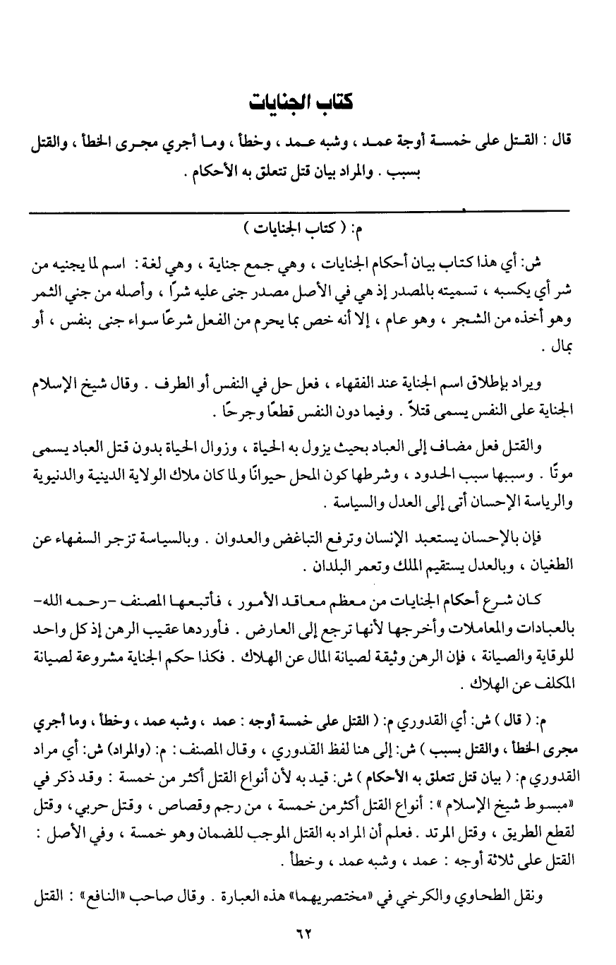كتاب الجنايات قال: القتل على خمسة أوجه عمد، وشبه عمد، وخطأ، وما أجري مجرى الخطأ، والقتل بسبب. والمراد بيان قتل تتعلق به الأحكام.