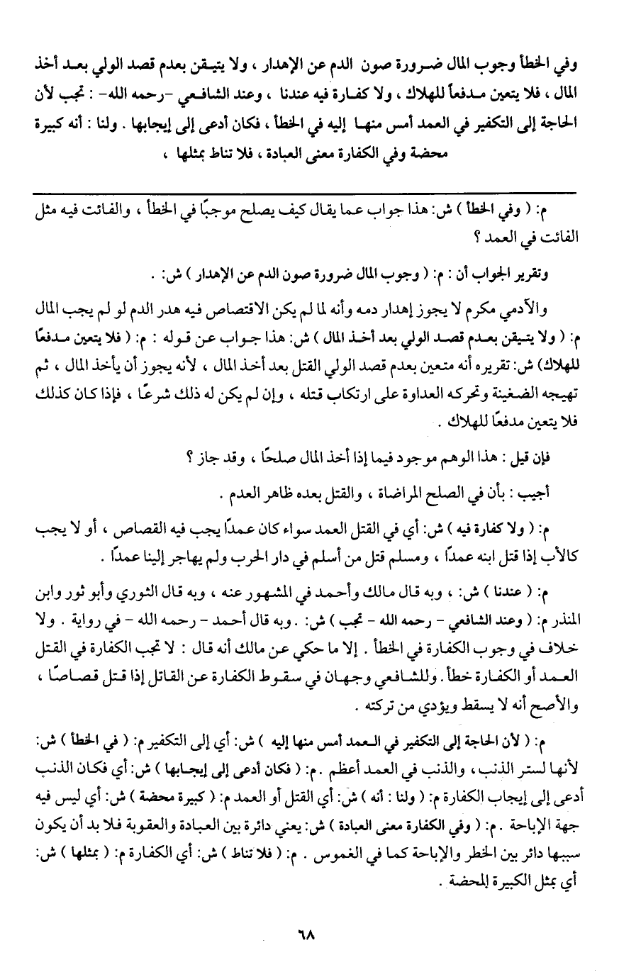 وفي الخطأ وجوب المال ضرورة صون الدم عن الإهدار، ولا يتيقن بعدم قصد الولي بعد أخذ المال، فلا يتعين مدفعا للهلاك، ولا كفارة فيه عندنا، وعند الشافعي - رَحِمَهُ اللَّهُ -: تجب لأن الحاجة إلى التكفير في العمد أمس منها إليه في الخطأ، فكان أدعى إلى إيجابها. ولنا: أنه كبيرة محضة وفي الكفارة معنى العبادة، فلا تناط بمثلها،